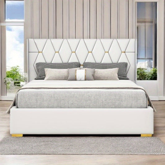 Off-white Queen Size Platform Bed featuring Metal Strips