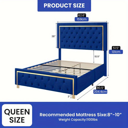 IndustraGear Queen Size Bed Frame with 51. 52Inch Tall Button Tufted Headboard, Velvet Upholstered Platform Bed Frame with Golden Trim, Modern Bed Frame/ No Box Spring Required/ Blue