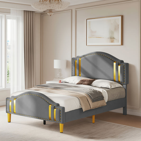 Velvet Platform Bed Frame with LED Frame and Stylish Mental Bed Legs, No Box Spring Needed