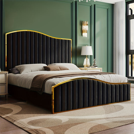 King size 61.4" High Headboard Platform Bed Velvet Upholstered with Golden Trim & Footboard Black