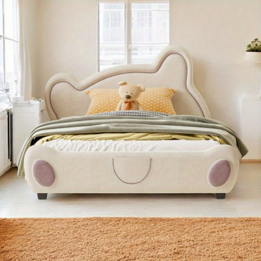 Full-Size Bear-Headboard Platform Bed featuring Bed-End Storage Pocket, Soft Beige Color