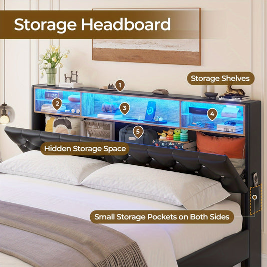 Bed Frame Queen Size With 4 Storage Drawers And LED Lights, Upholstered Platform Bed Frame With Height Adjustable Headboard And USB Ports, Led Bed Frame Queen, No Box Spring Needed, Black