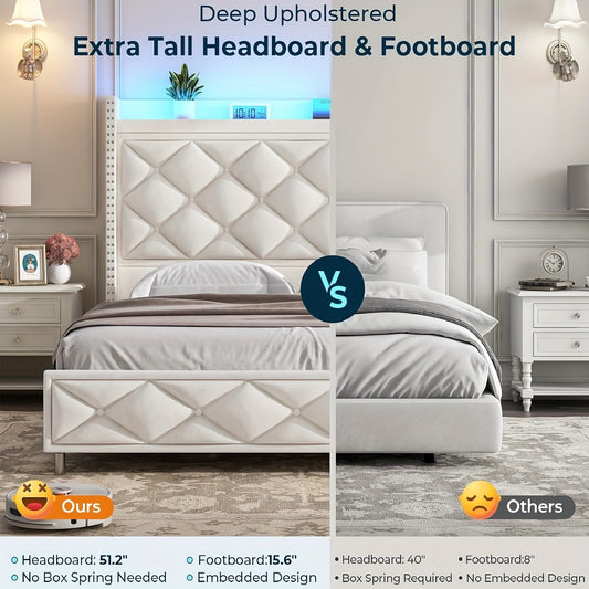 King/Queen Size Bed Fame With Tall Headboard And Charging Station, LED Platform Bed Frame With LED Lights Button Tufted Storage Headboard, No Box Spring Needed, White