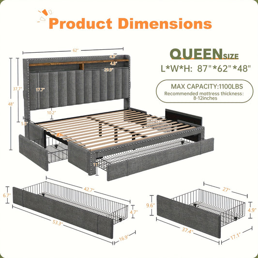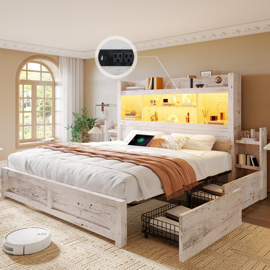 Bed Frame, Storage Headboard with Charging Station & LED Lights Bed Storage Headboard & Drawers, Heavy Duty Wood Slats, Easy Assembly