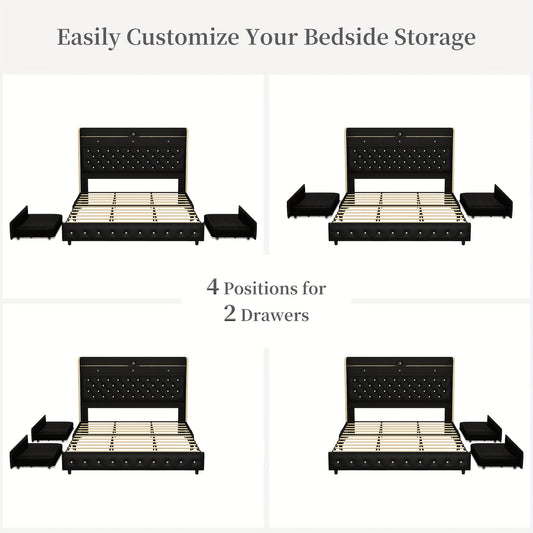 Queen/King Upholstered Platform Bed with LED Lights - 4 Storage Drawers& Adjustable Channeled Headboard, No Box Spring