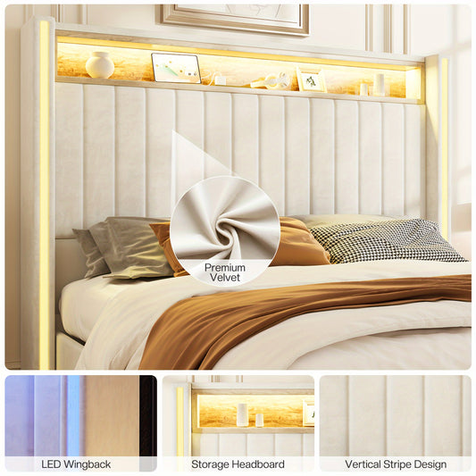 PaPaJet Bed Frame with LED Lights And Charging Station, Velvet Upholstered Platform Bed with 53" Tall Storage Headboard And Wingbacks, No Box Spring Needed