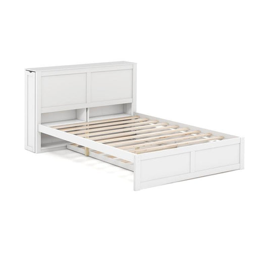 SAFSTAR Twin/Full Platform Bed with Trundle, Wooden Bed Frame with 2 Rolling Bookcases & High Headboard, Storage Platform Bed for Girls Boys, No Box Spring Needed, White