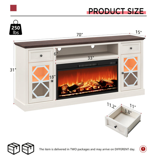 Rustic Farmhouse 70" TV Stand with 37" Electric Fireplace - LED Media Center for Up to 80" TVs, USB Powered, Hardwood Construction, Entertainment Center