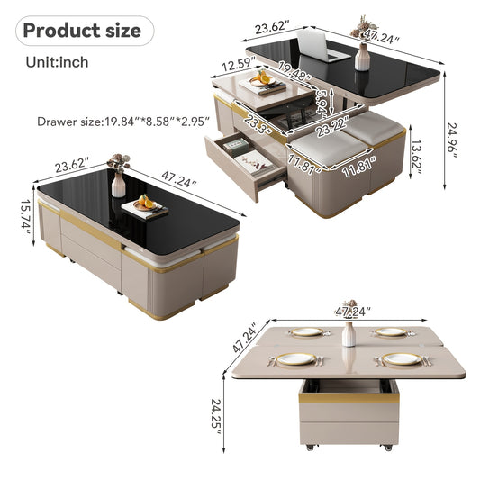 Versatile 3-in-1 Lift Top Coffee Table with Wheels - Extendable & Foldable, Includes 4 Storage Stools, Space-Saving Design for Living Room, Easy Assembly, Available in Gray/Black, Coffee Table for Living Room, Modern, Dining