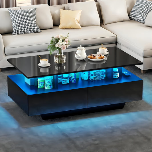 Xelsyo Modern LED Coffee Table with RGB Light System, 20 Colors & 4 Modes, High Gloss Finish, Double-Layer Storage & 4 Drawers, Suitable for Office, Living Room, 21.7"D X 35.4"W X 16.2"H