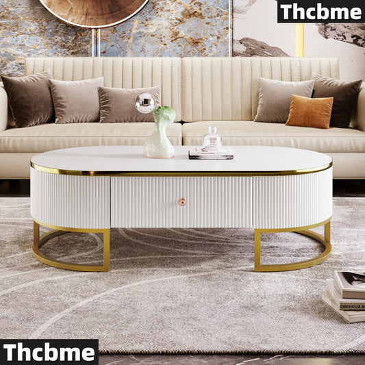 [1 Modern Oval Coffee Table] Thcbme Modern Oval Coffee Table, Wood Frame & Top, Space-Saving Curved Profile Design, with 2 Large Drawers, Golden Metal Accents, for Living Room, Office, Bedroom - White & Golden