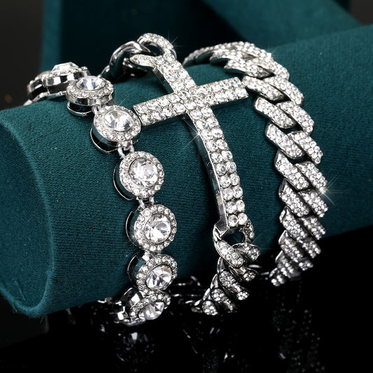 3pcs Set: Hip Hop Miami Link Bracelets with Shiny Rhinestones - Durable Alloy, Perfect for Everyday & Party Wear