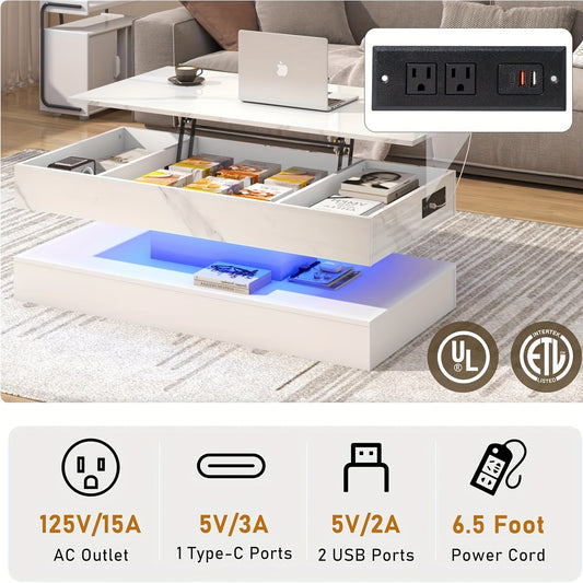 47.2" Large Lift Top Coffee Table With Charging Station, LED Modern High Glossy Center Table With Hidden Compartment Storage, White Lift Living Room Tables With Marbling Print