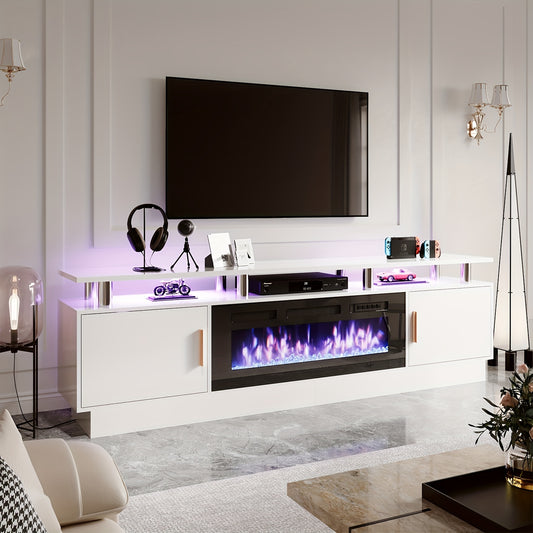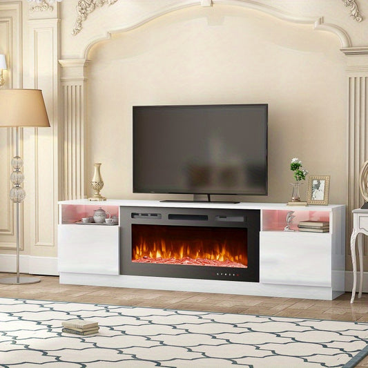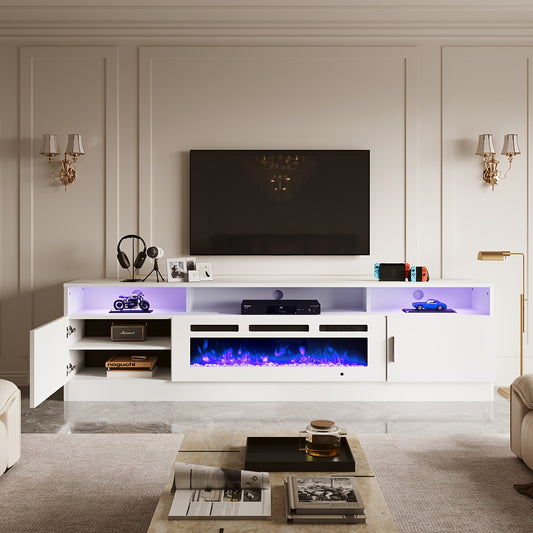 70"/80" Modern Electric Fireplace TV Stand For TVs Up To 80 Inch, With Electronic Flame And LED Lights, Luxury High Gloss Finish Entertainment Center For Living Room, White