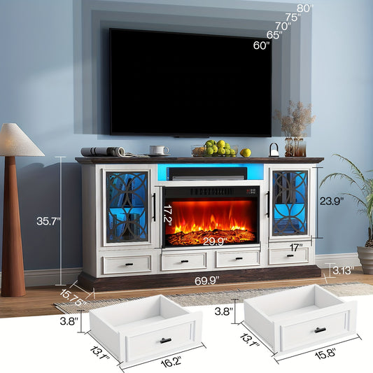 70" White Modern Fireplace TV Stand - Sleek Entertainment Center with Built-in Electric Fireplace, LED Lights, and Space for Modern TVs