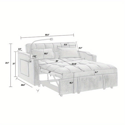 55.5" Convertible Sleeper Sofa With Pull Out Bed, 3-in-1 Loveseat Sofa With USB Ports, 2 Cup Holders & Storage Pockets, Velvet Sleeper Sofa Bed With Adjustable Backrest