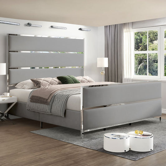 A Velvet Upholstered Platform Bed Frame comes with a 59" Tall Headboard and Footboard, emphasized by Silver Mirrored Plating - and a Box Spring is not necessary