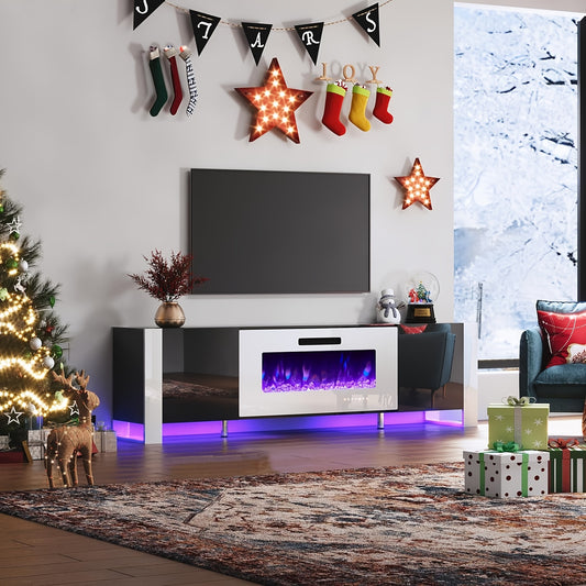 80" Fireplace TV Stand With Built-In Electric Fireplace, Sleek Entertainment Center With LED Lights For Modern TVs Black With White