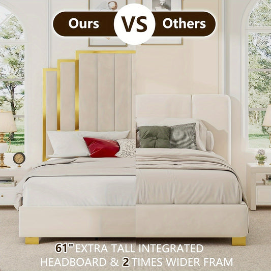King Modern Upholstered Bed Frame with 61-Inch Headboard and Gold Plating Trim, No Box Spring Required Cream