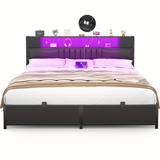 ISunirm King Size Bed Frame With LED Light & Power Outlets, Platform Bed With Upholstered Headboard And Storage, Sturdy Metal Slats Support, No Box Spring Needed, Easy Assembly, Noise-Free, Black