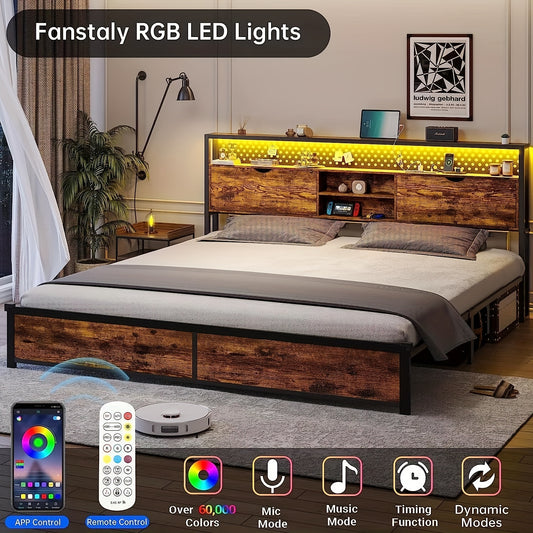 King Size Bed Frame With Led Light Charge Station Wood Metal Platform Bed Headbord Storage
