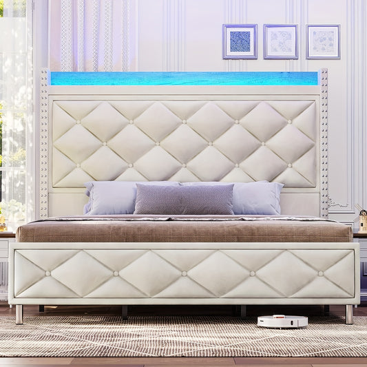 King Size Bed Frame With Tall Headboard & LED Lights Modern LED Platform Bed Frame Beige