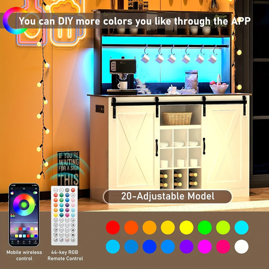 LED Bar w/60000-color LED Lights, 6FT Outlet, Adjustable Shelf. Tea/Liquor/Wine Bar Cabinet w/9PCS Bottles Storage, 6PCS Hook, Sliding Barn Door for Farmhouse
