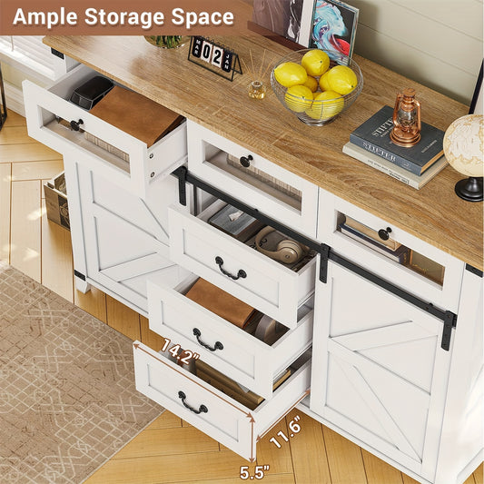Farmhouse Dresser with LED Lights & Glass Drawers, Chest of Drawers with Sliding Barn Doors for Living Room Bedroom Entryway, White