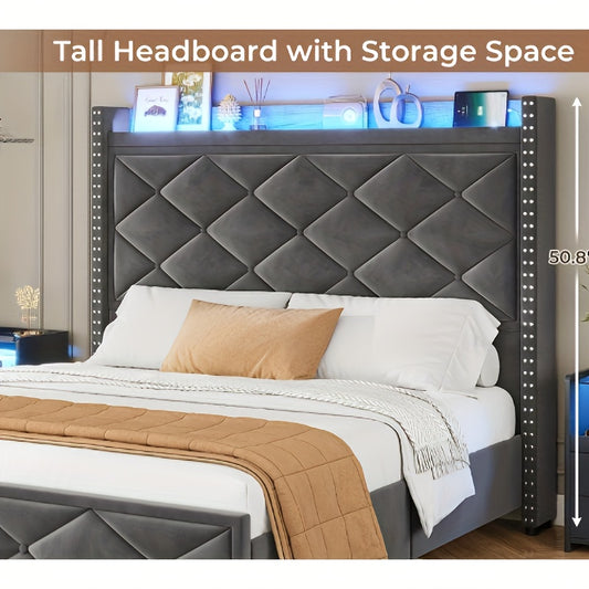 PaPaJet Bed Frame with LED Lights And Charging Station, Velvet Upholstered Platform Bed with 53" Tall Storage Headboard And Wingbacks, No Box Spring Needed