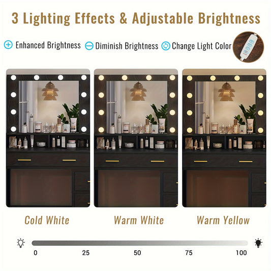 Makeup Vanity With Lights, Black Vanity Desk With Mirror & 3 Lighting Modes, Vanity Table With USB Ports And Outlets, Makeup Table With Nightstand & Storage Shelves & Drawers (Modern Black)