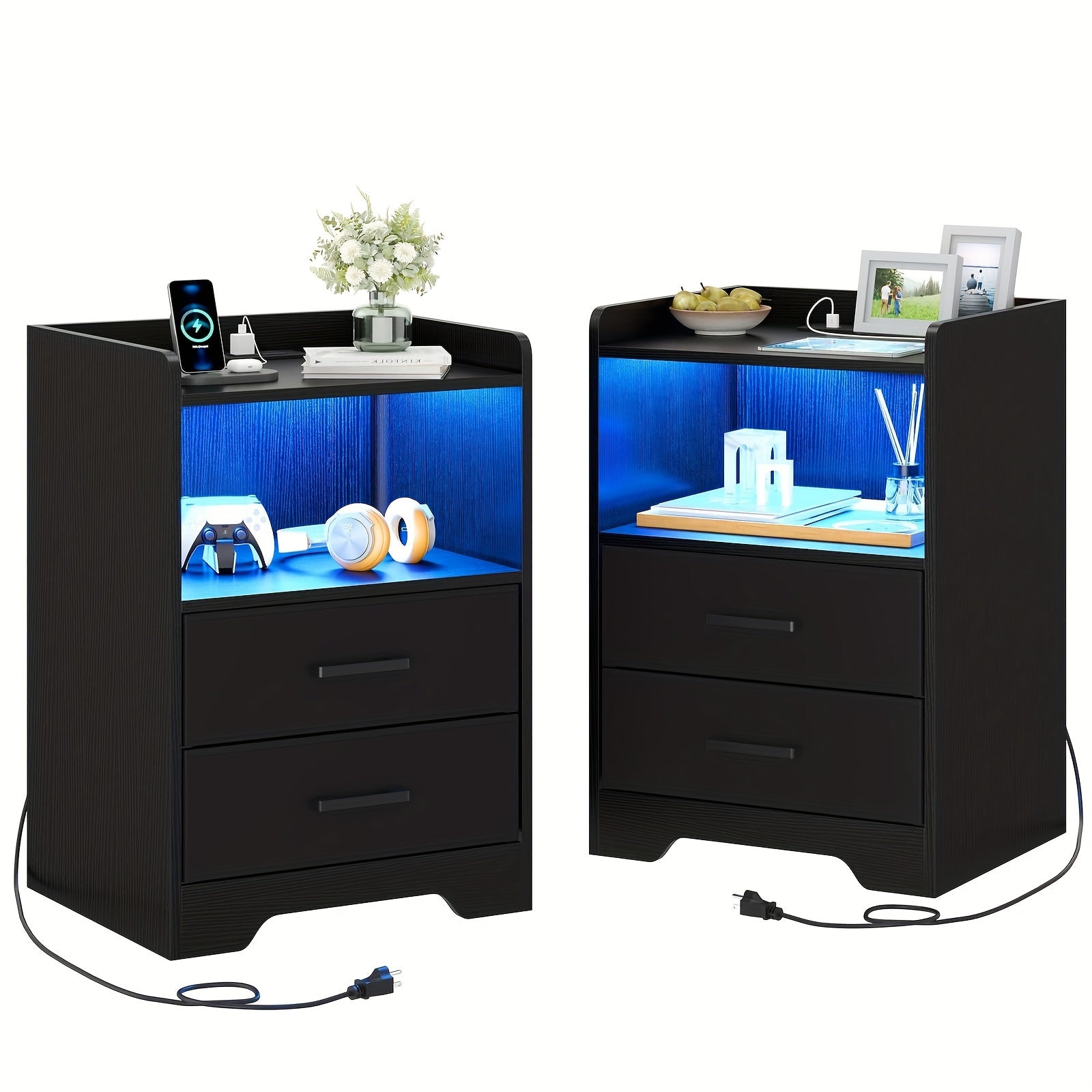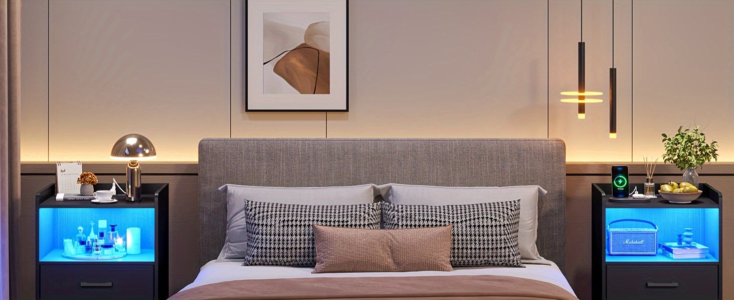 2pcs Black Nightstand with Storage Drawers for Bedroom, Modern Bedside Table Nightstands with Charging Station and LED Lights