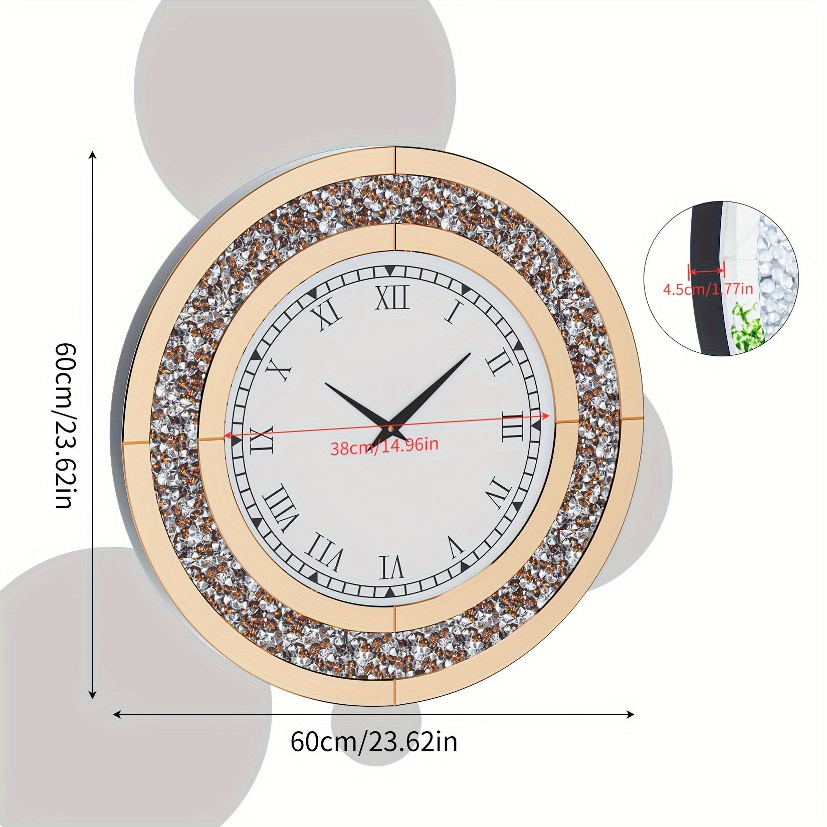 Decorative Wall Clock Round Mirror Clock with Crystal Crushed Diamond Mirrored Sparkle Bling Wall Clock for Glam Room Living Room, Bedroom Decor