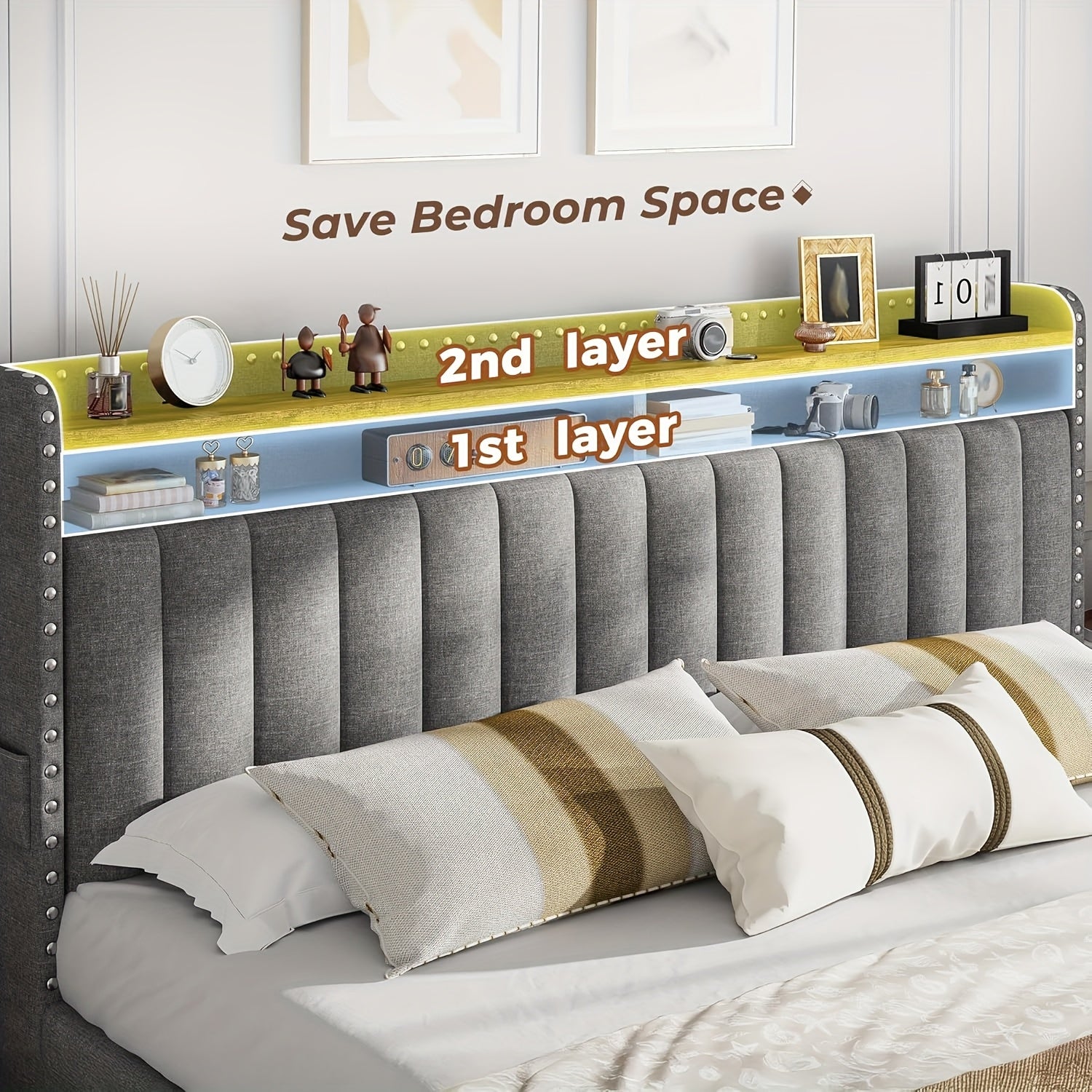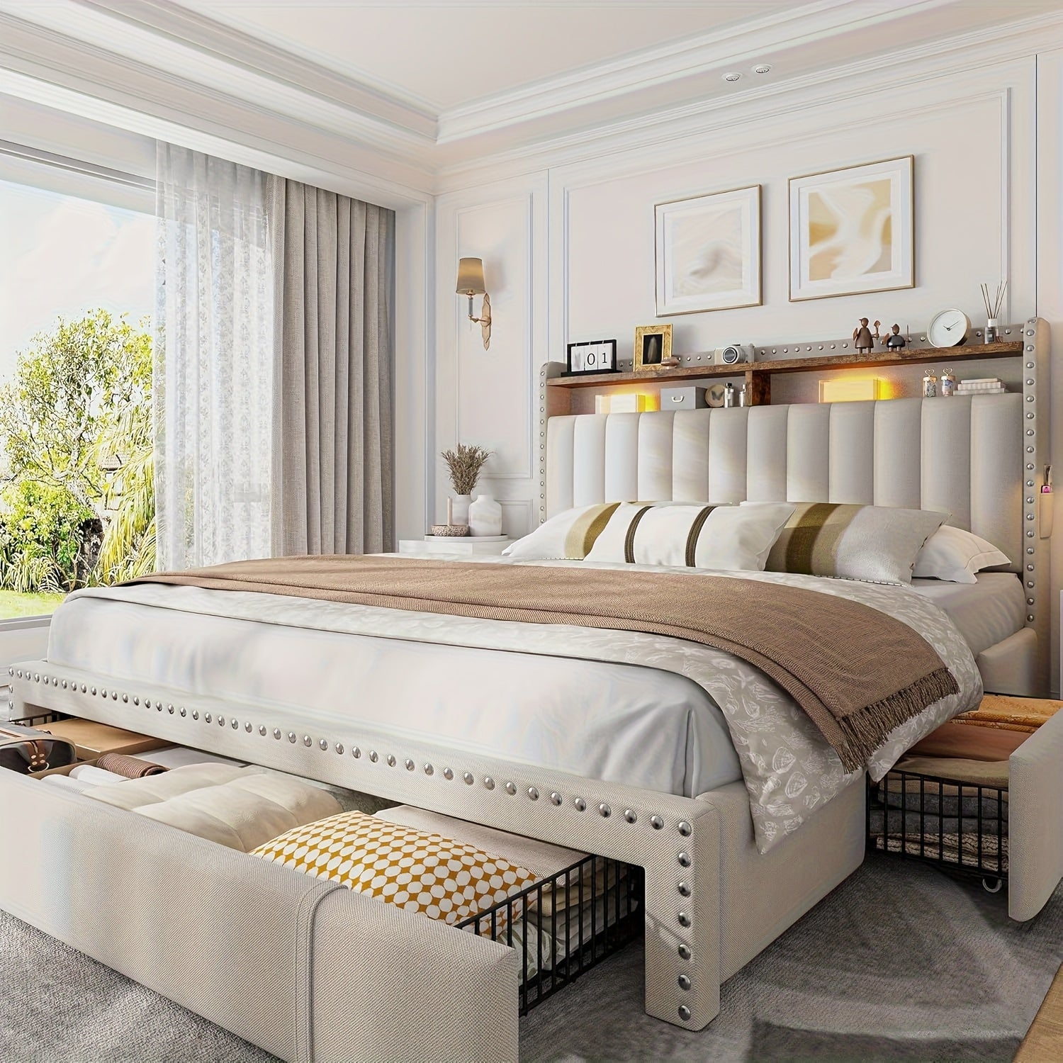 ENHOMEE King Size Upholstered Storage Bed with 3 Drawers & 2-Tier Nightstand Shelves - Modern Platform Bed Frame, Quick Assembly, Metal Frame, Contemporary Style