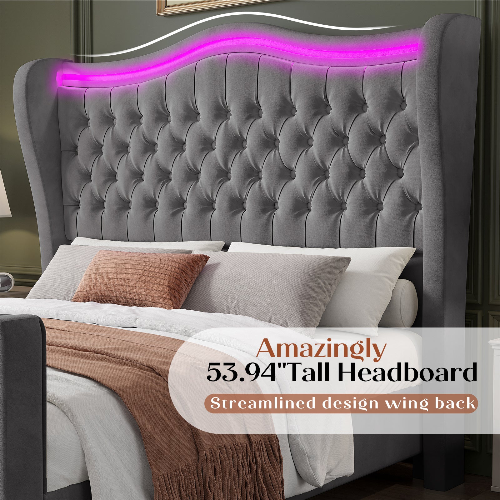 Exquisite Albott Platform Bed Frame with Integrated LED Lighting, 53-Inch Upholstered Wingback Design Accentuated by a Finely Crafted Deep Button-Tufted Headboard and Footboard - Comparable to Amazon's Finest