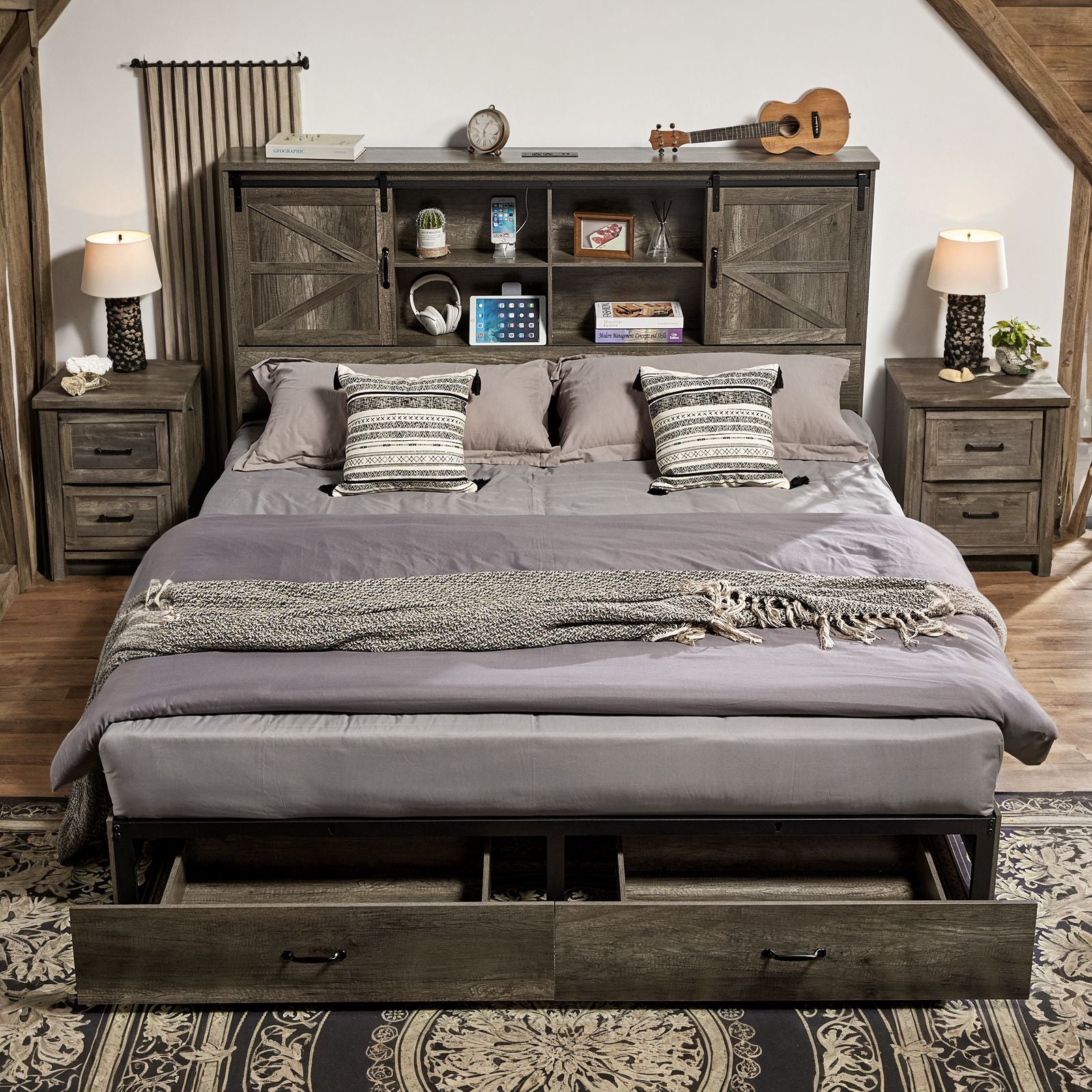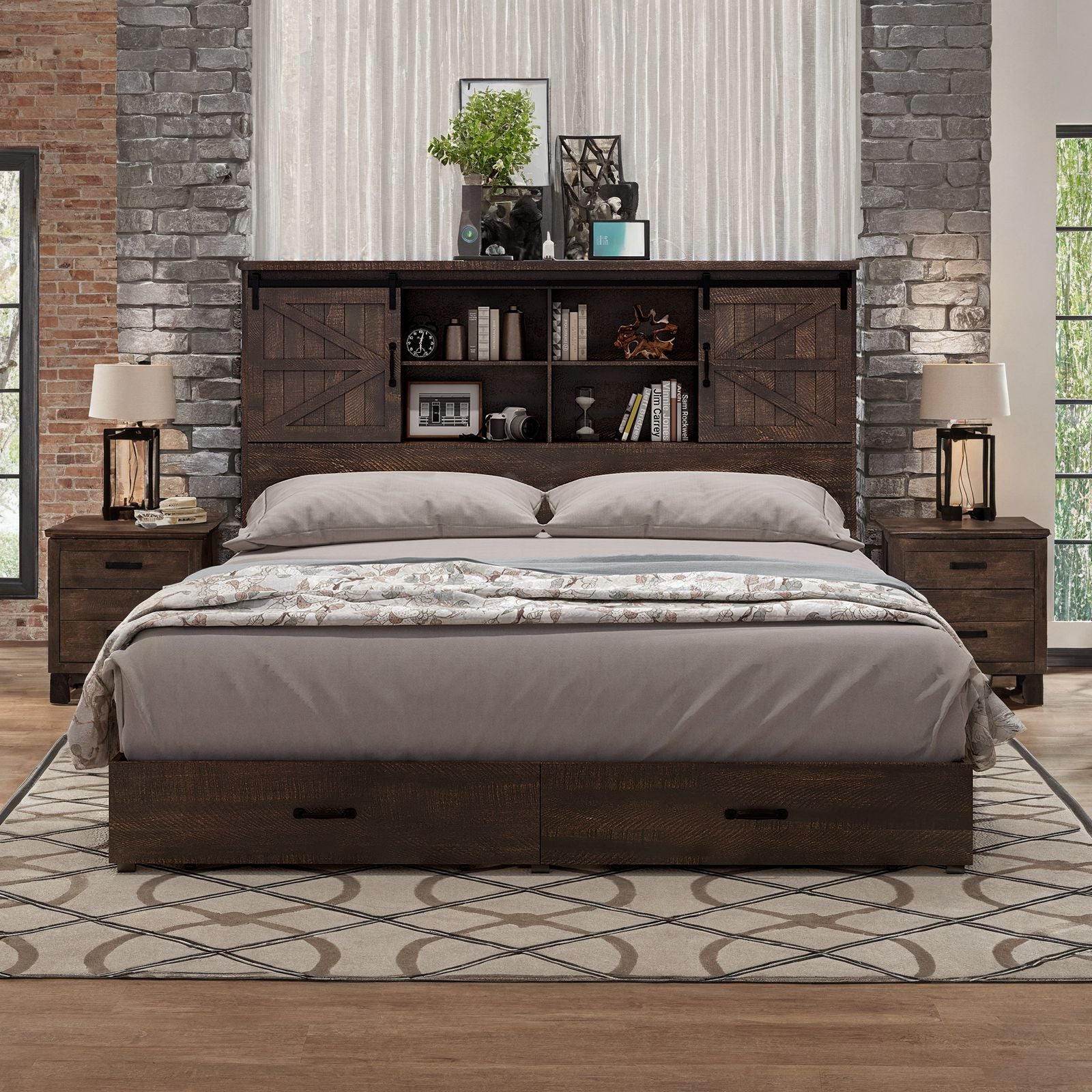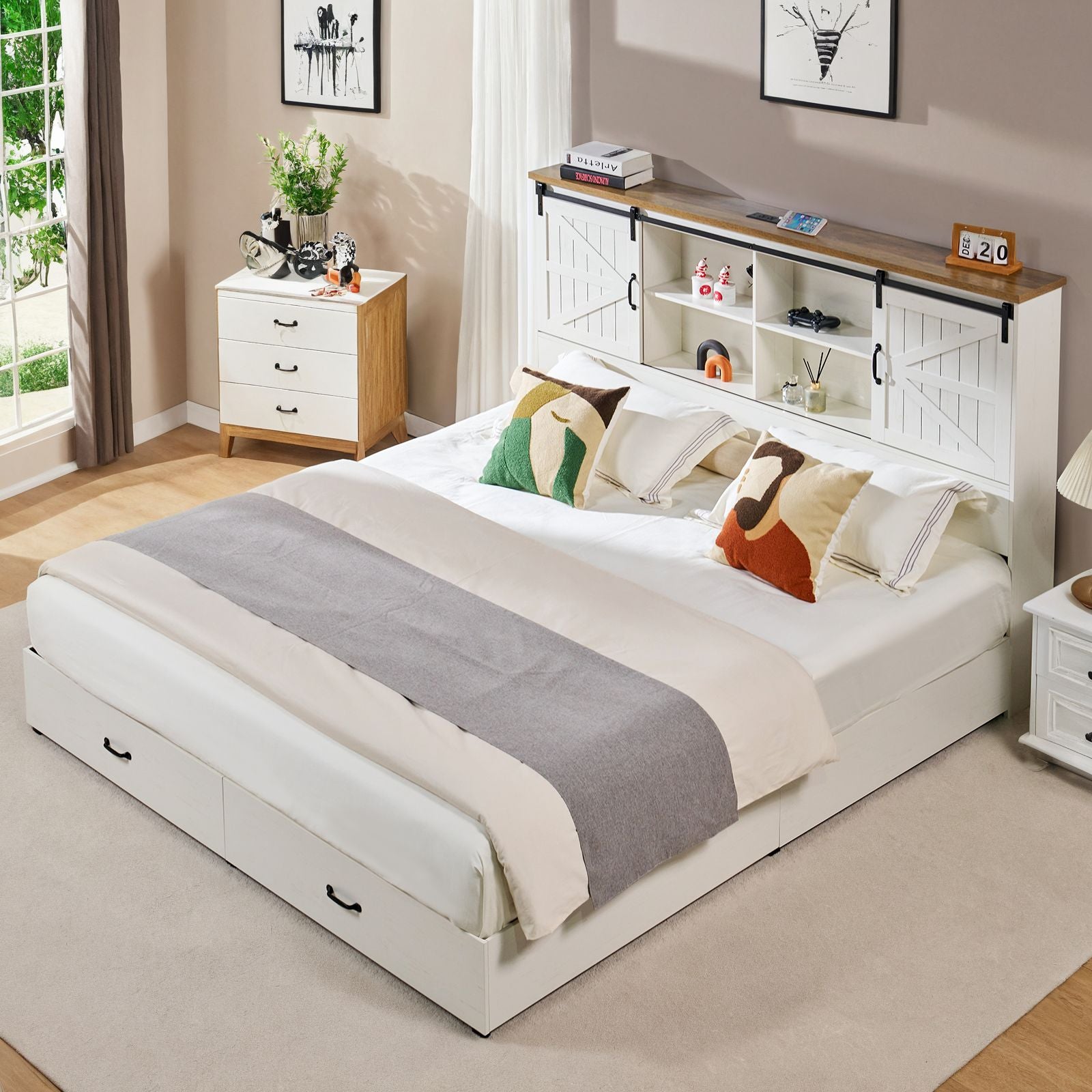 Farmhouse-Style Wooden Platform Bed Frame Boasting a 51.2" Bookcase Headboard, Integrated Storage with a Sliding Barn Door Charging Station and 2 Drawers - No Box Spring Required, Totally Noise-Free
