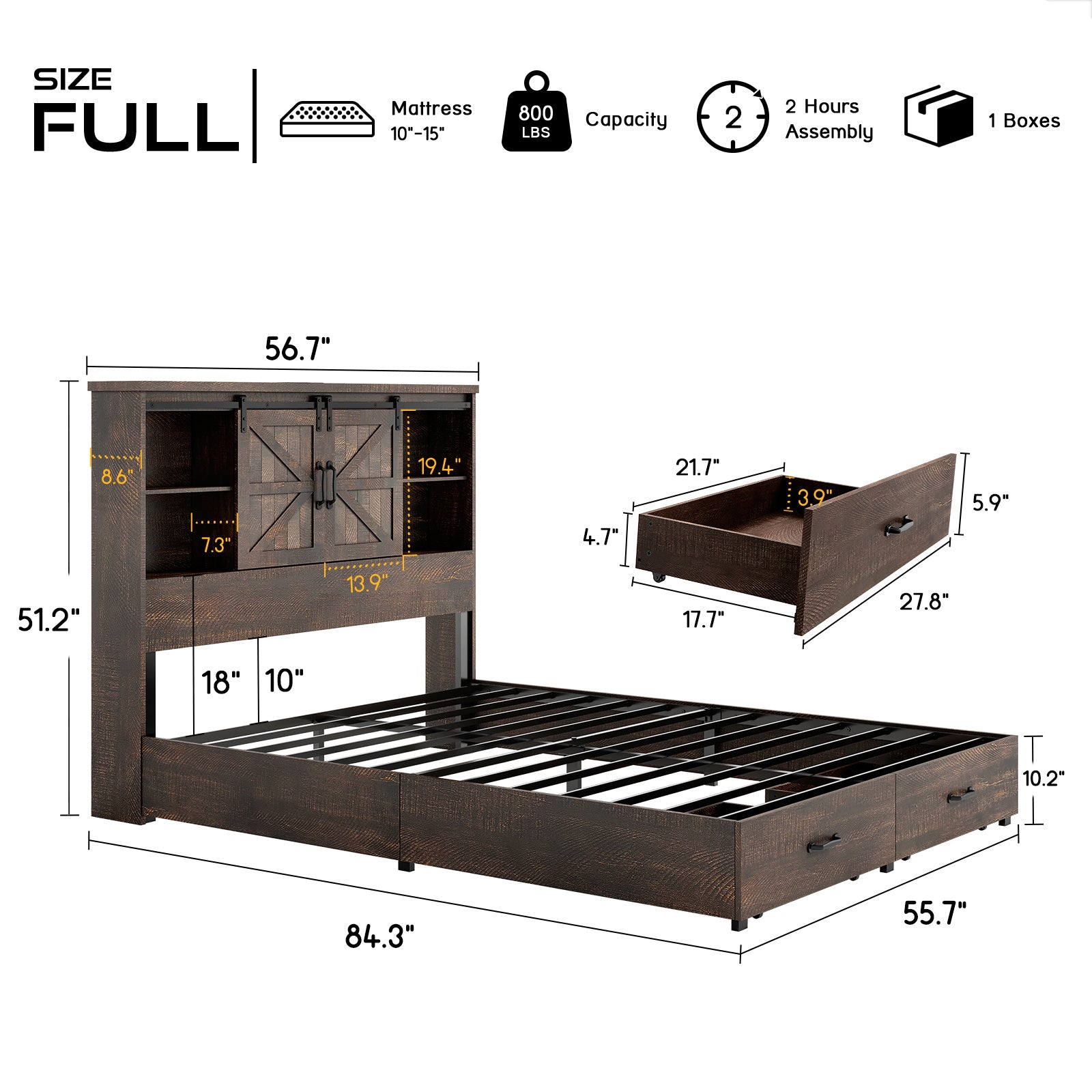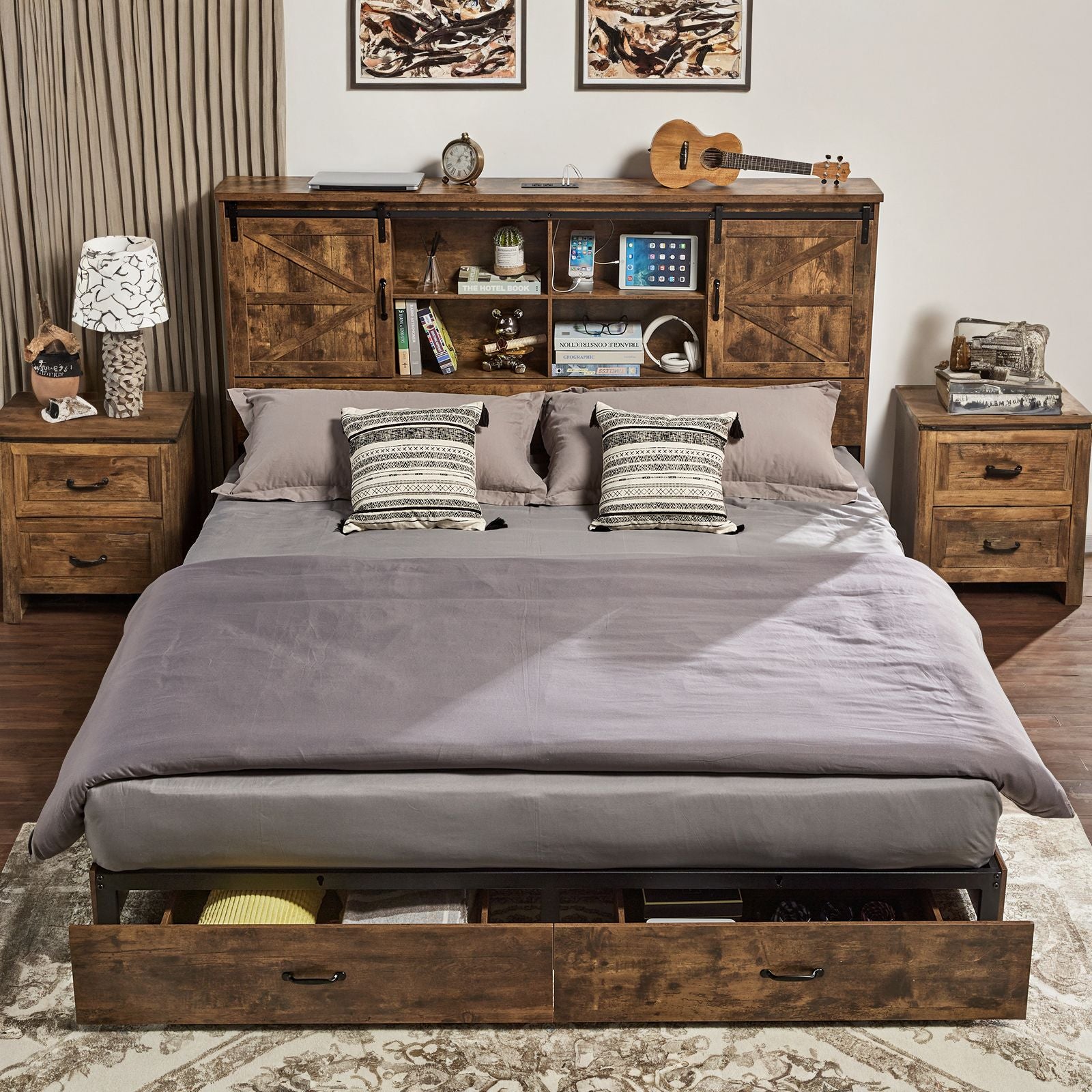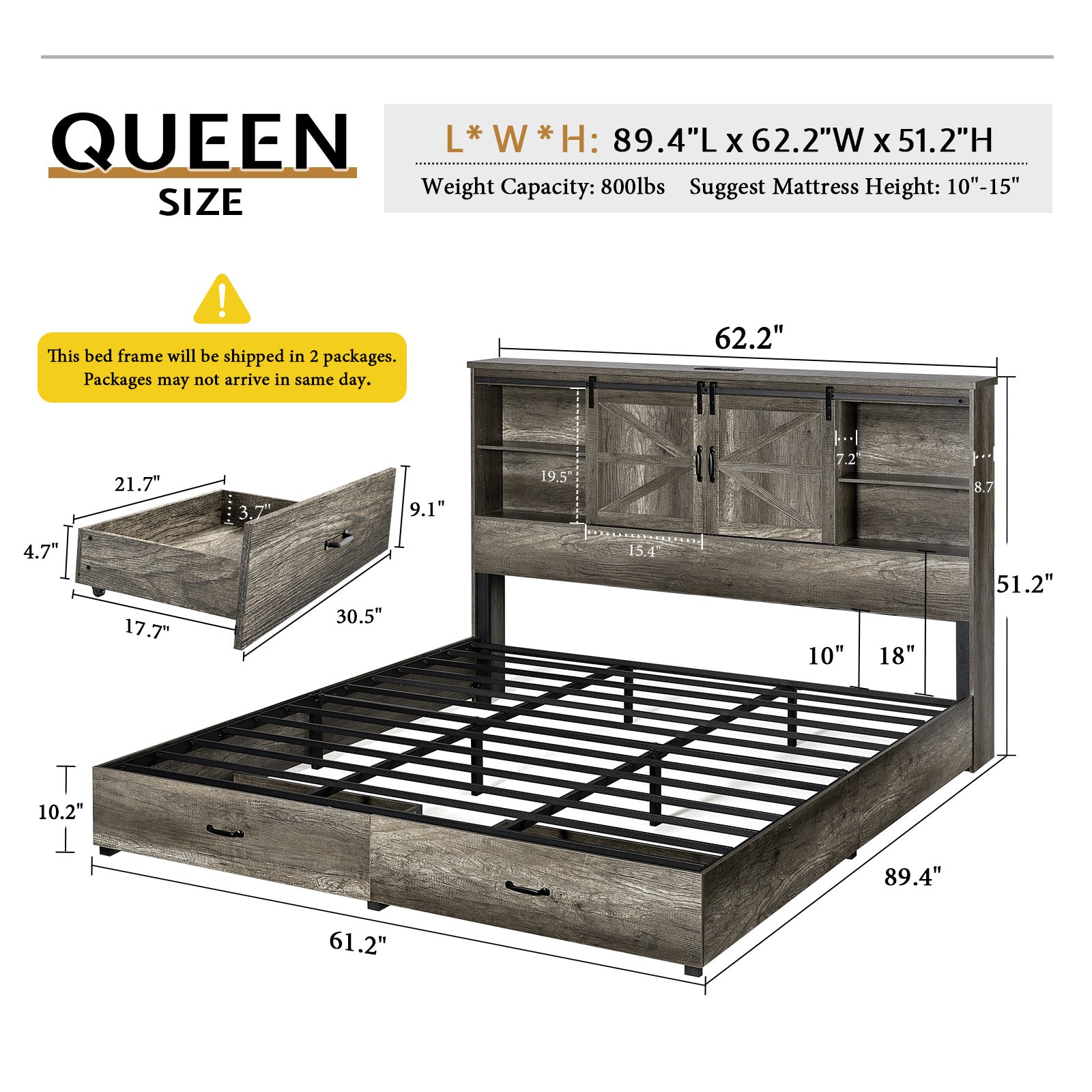 Farmhouse-Style Wooden Platform Bed Frame Boasting a 51.2" Bookcase Headboard, Integrated Storage with a Sliding Barn Door Charging Station and 2 Drawers - No Box Spring Required, Totally Noise-Free