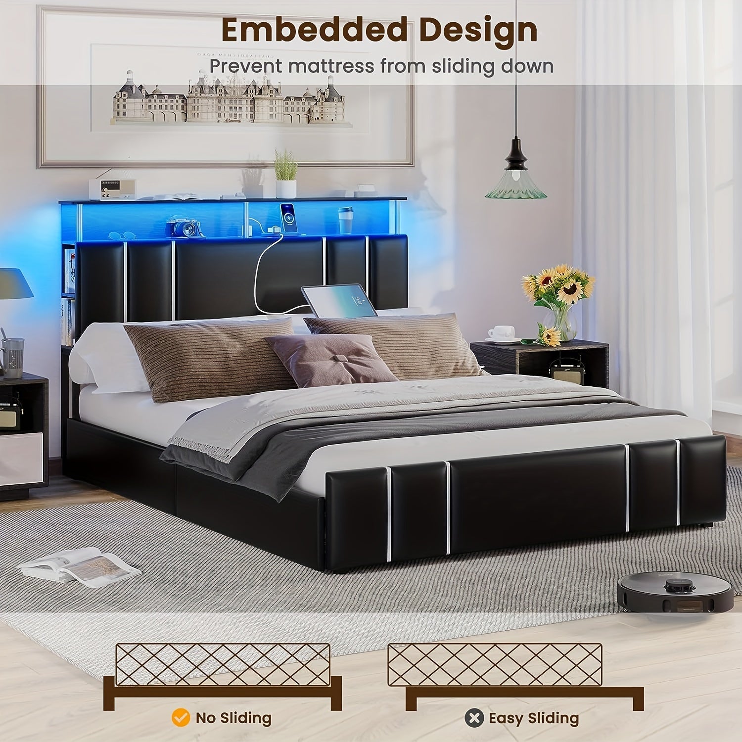 Full LED Bed Frame with Power Outlets and 4 Drawers, Upholstered Platform Bed with Open Shelves and Hidden Storage, Black