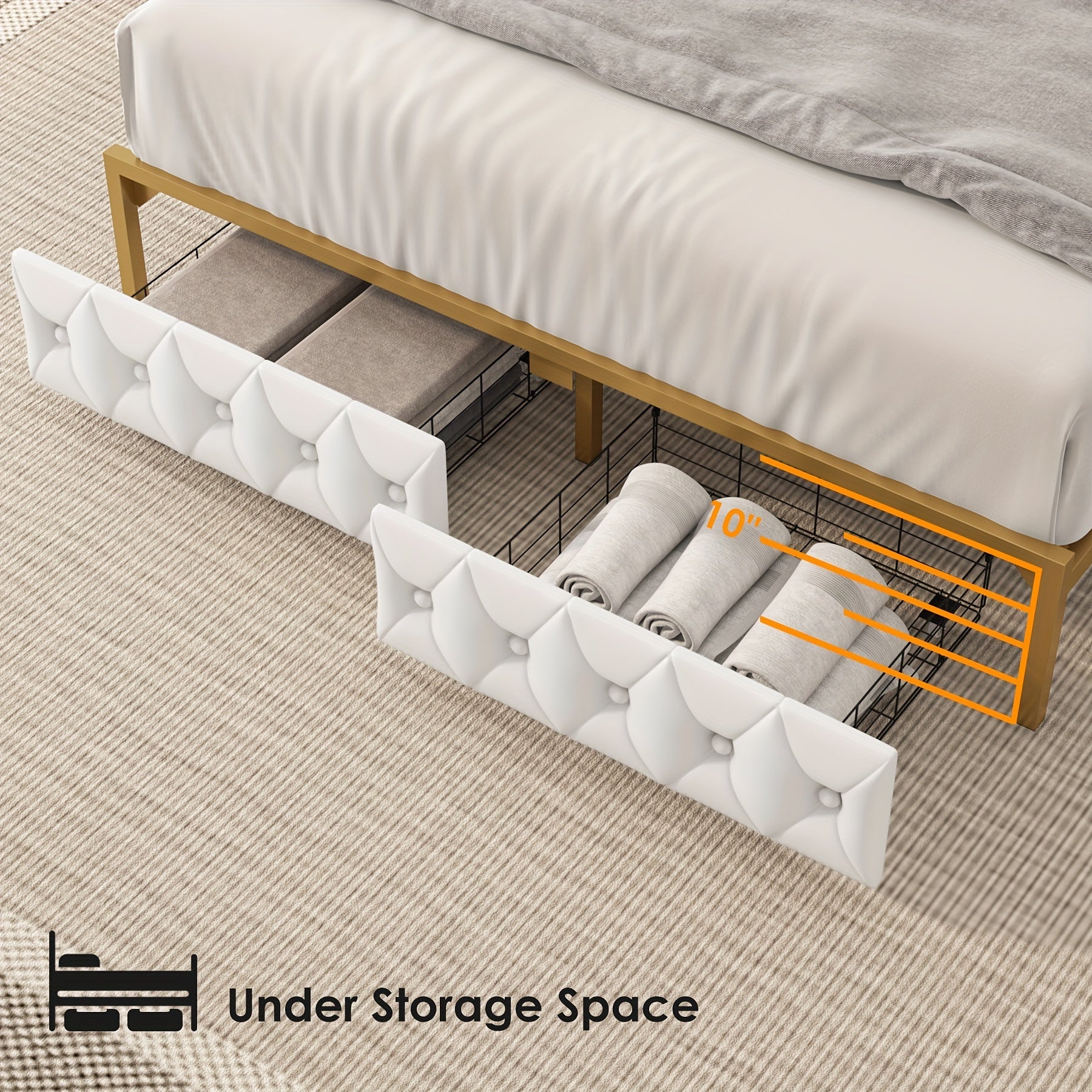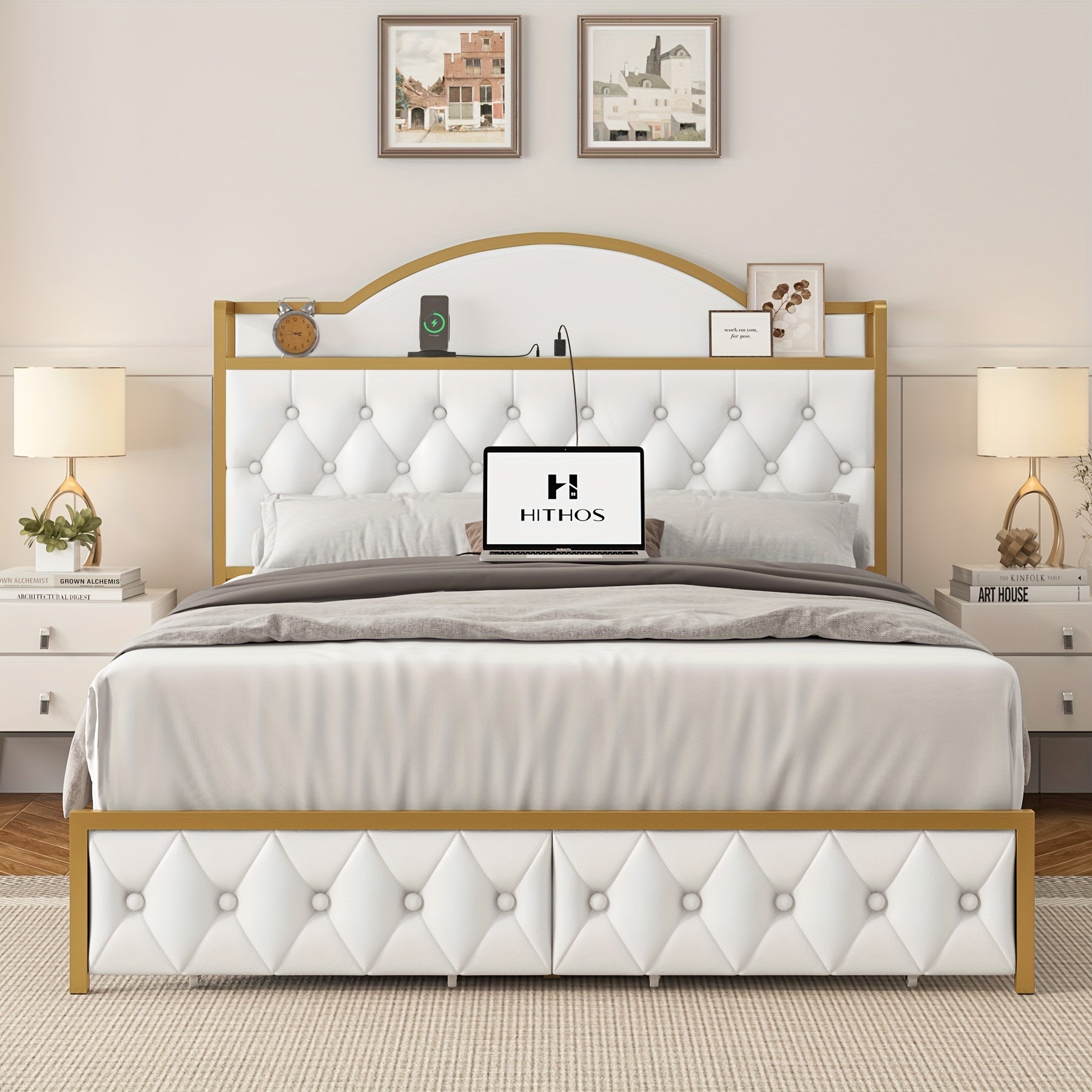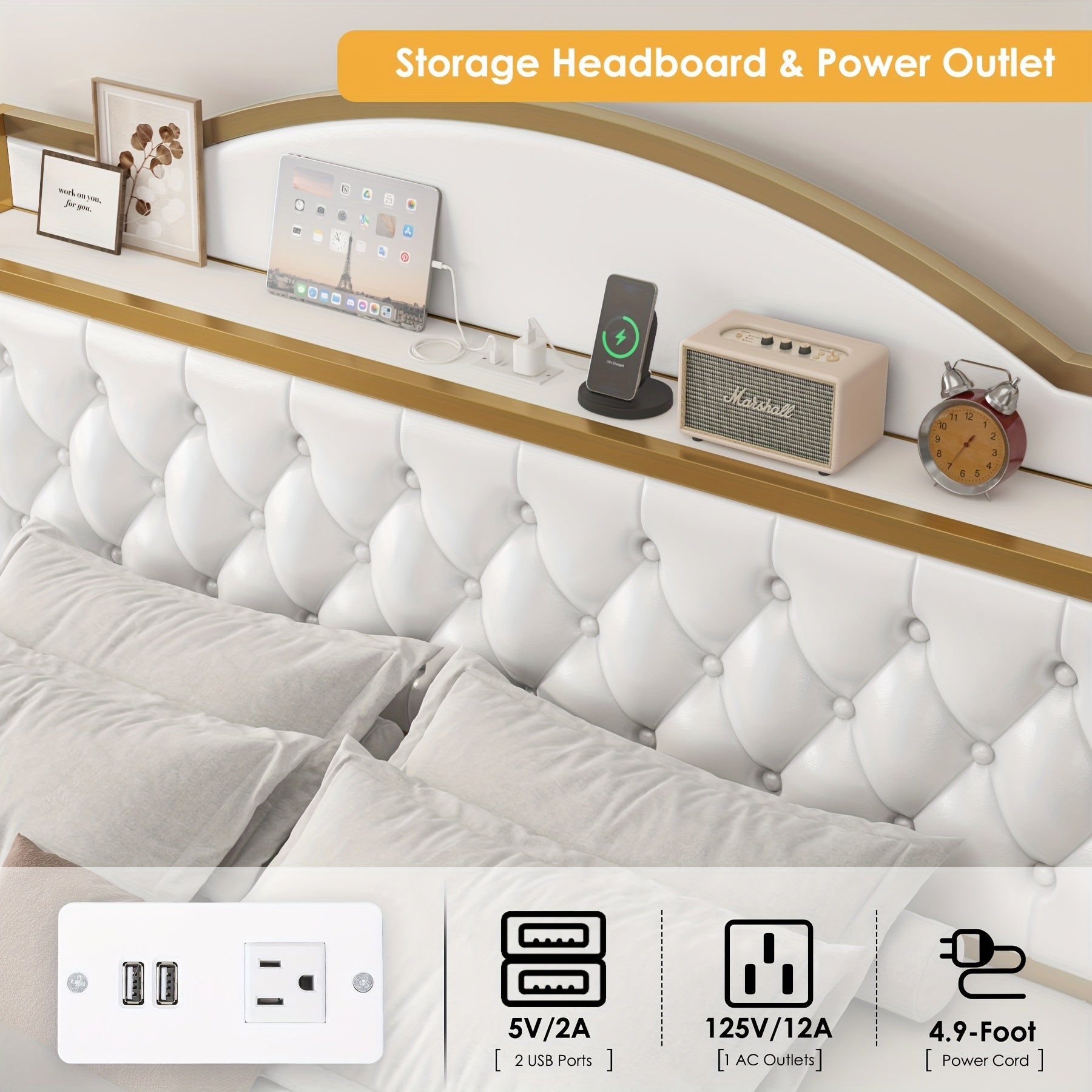 FULTRU Full/Queen/King Size Bed Frame with Storage Headboard, Platform Bed Frame with Storage Headboard, Large Storage Drawers & Charging Station, No Box Spring Needed, Noise Free (White-PU, Cream-Velvet)