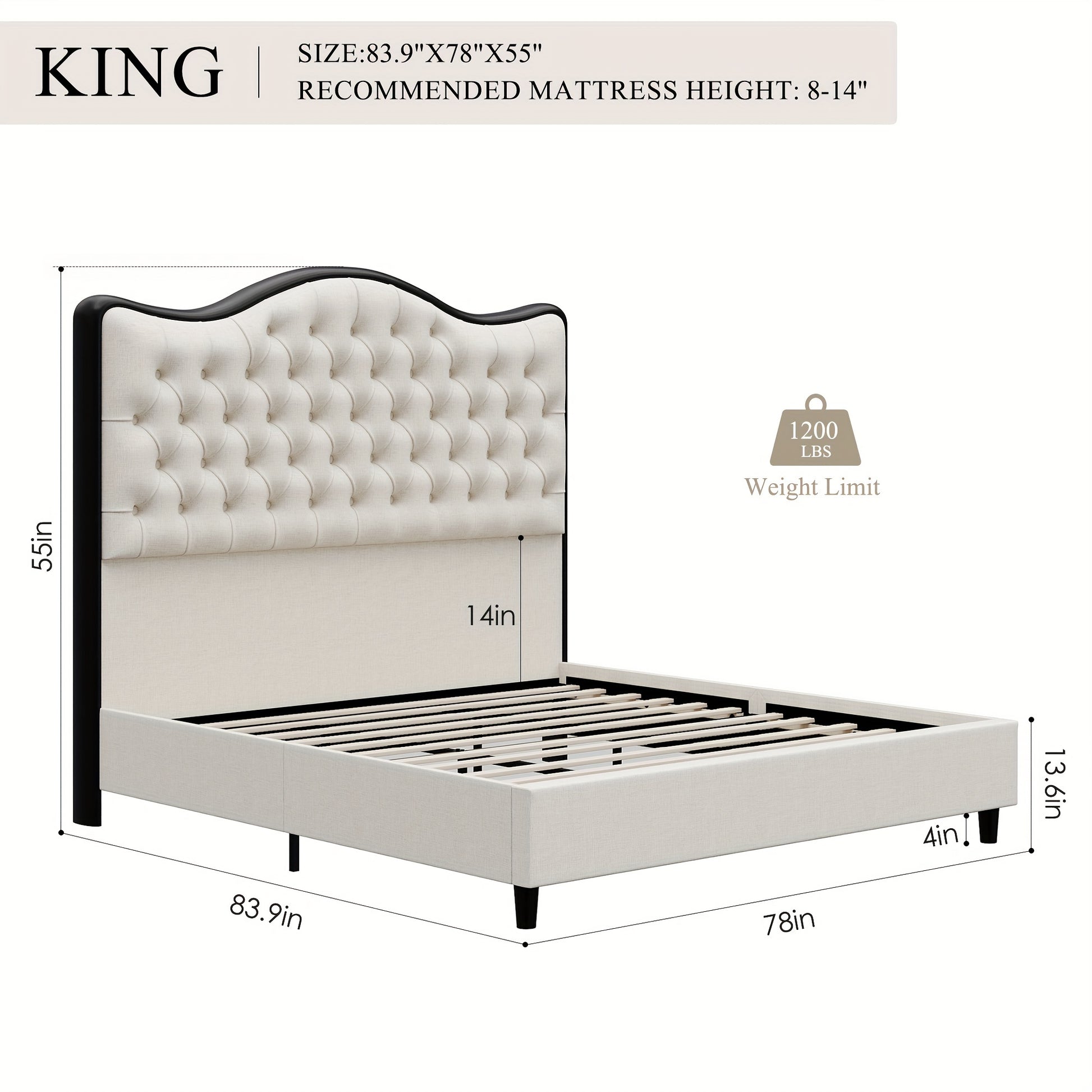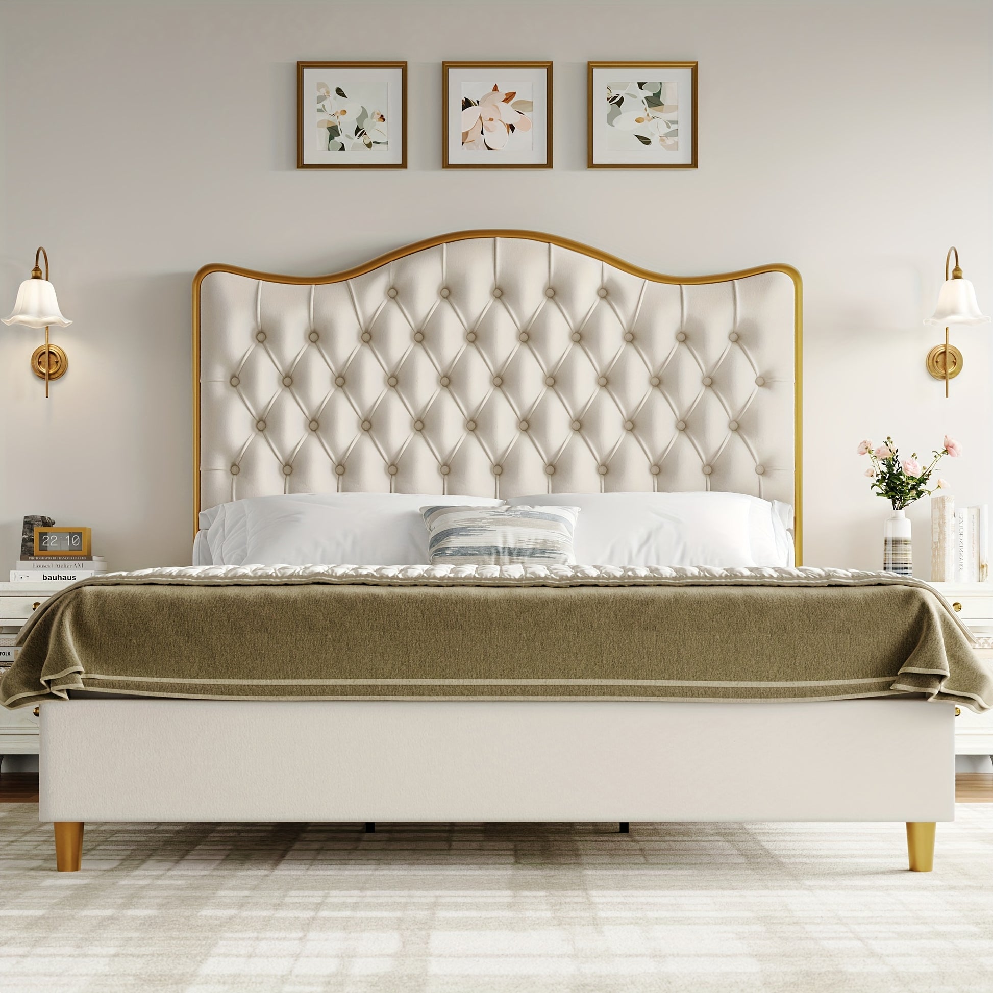 FULTRU Queen/King Size Bed Frame, 55" Tall Platform Bed with Curved Headboard, Velvet/Leather Upholstered Bed with Deep Tufted Button, Handmade Pleats, Gold/Black Metal Frame, Wooden Slats Support, No Box Spring Needed