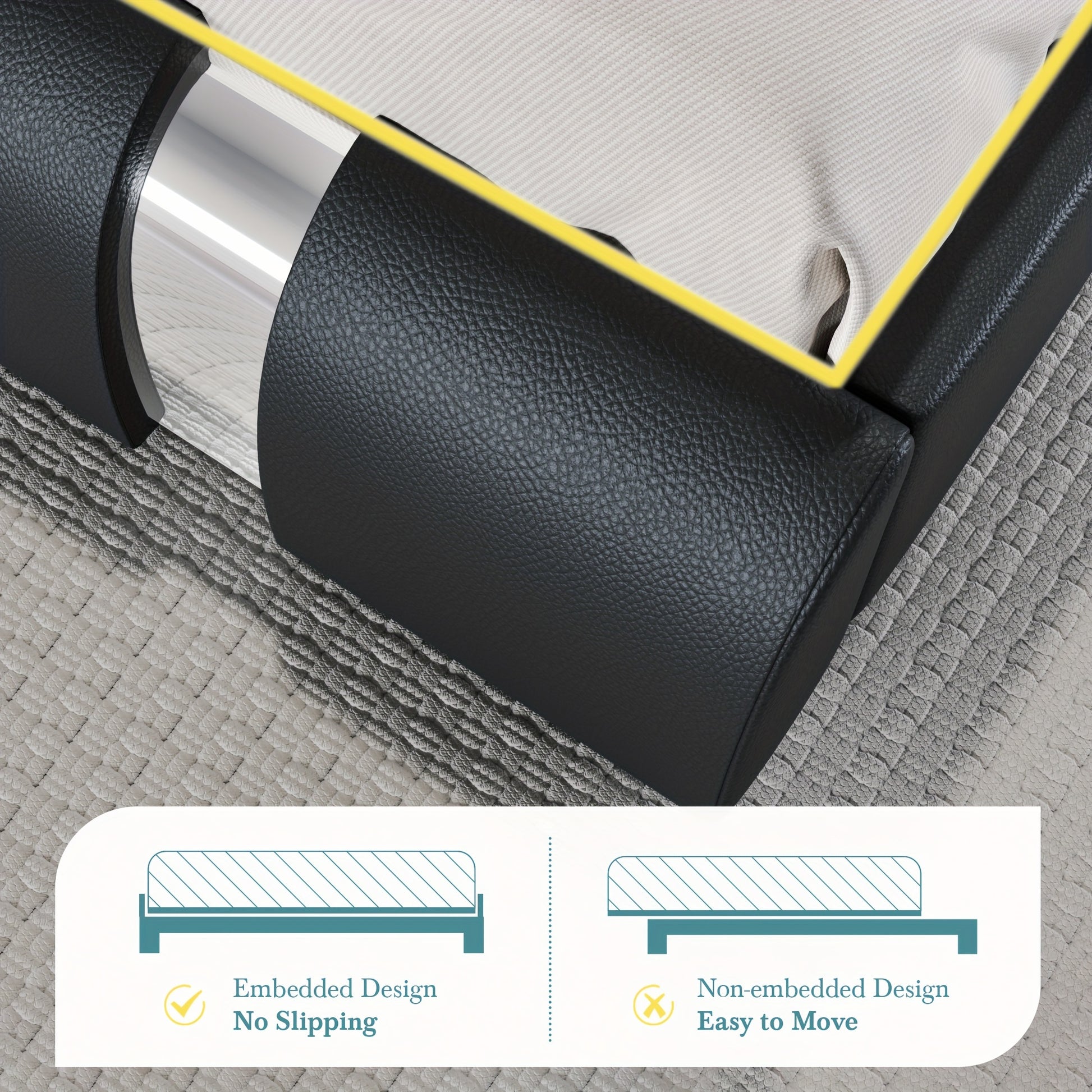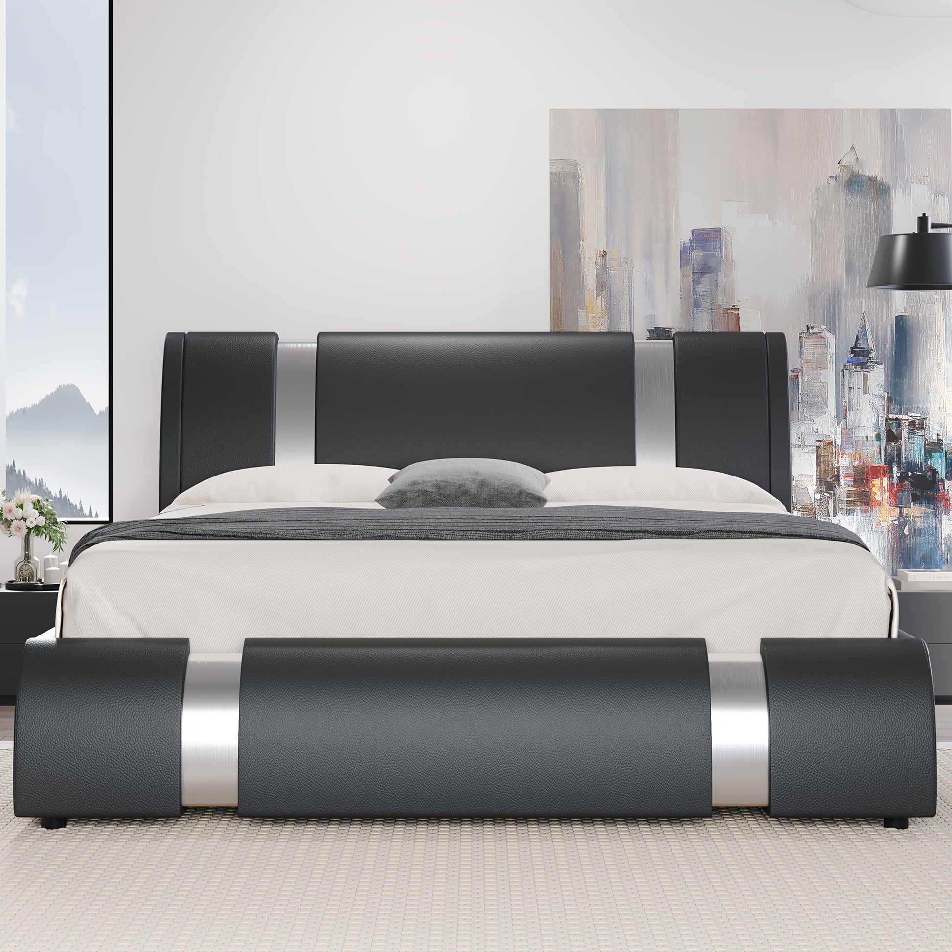 HOOMIC Modern Faux Leather Bed Frame With Iron Pieces Decor, Low Profile Platform Bed With Height-Adjustable Headboard, Solid Wood Slat Support, No Box Spring Needed