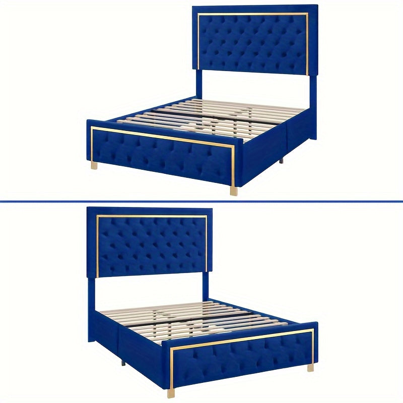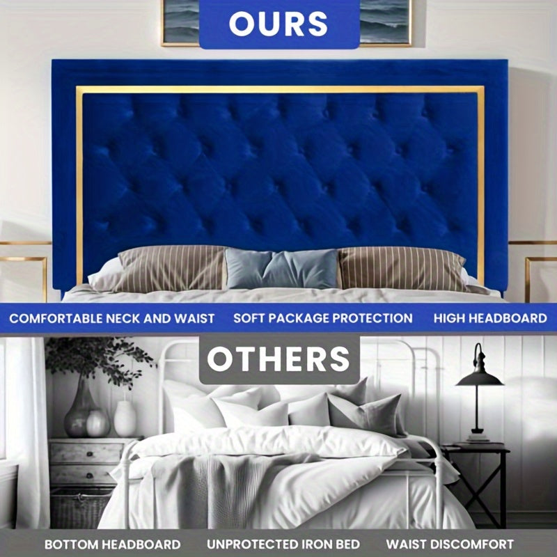 IndustraGear Queen Size Bed Frame with 51. 52Inch Tall Button Tufted Headboard, Velvet Upholstered Platform Bed Frame with Golden Trim, Modern Bed Frame/ No Box Spring Required/ Blue