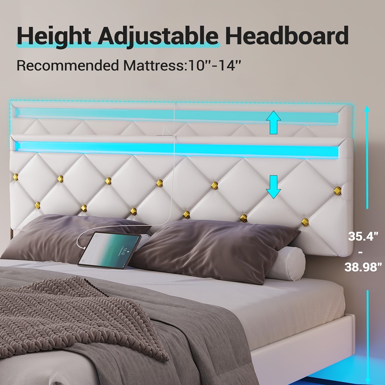 King Bed Frame With LED Light And USB Port, LED Bed Frame With Headboard Faux Leather Low Profile Floating Bed Frame, White