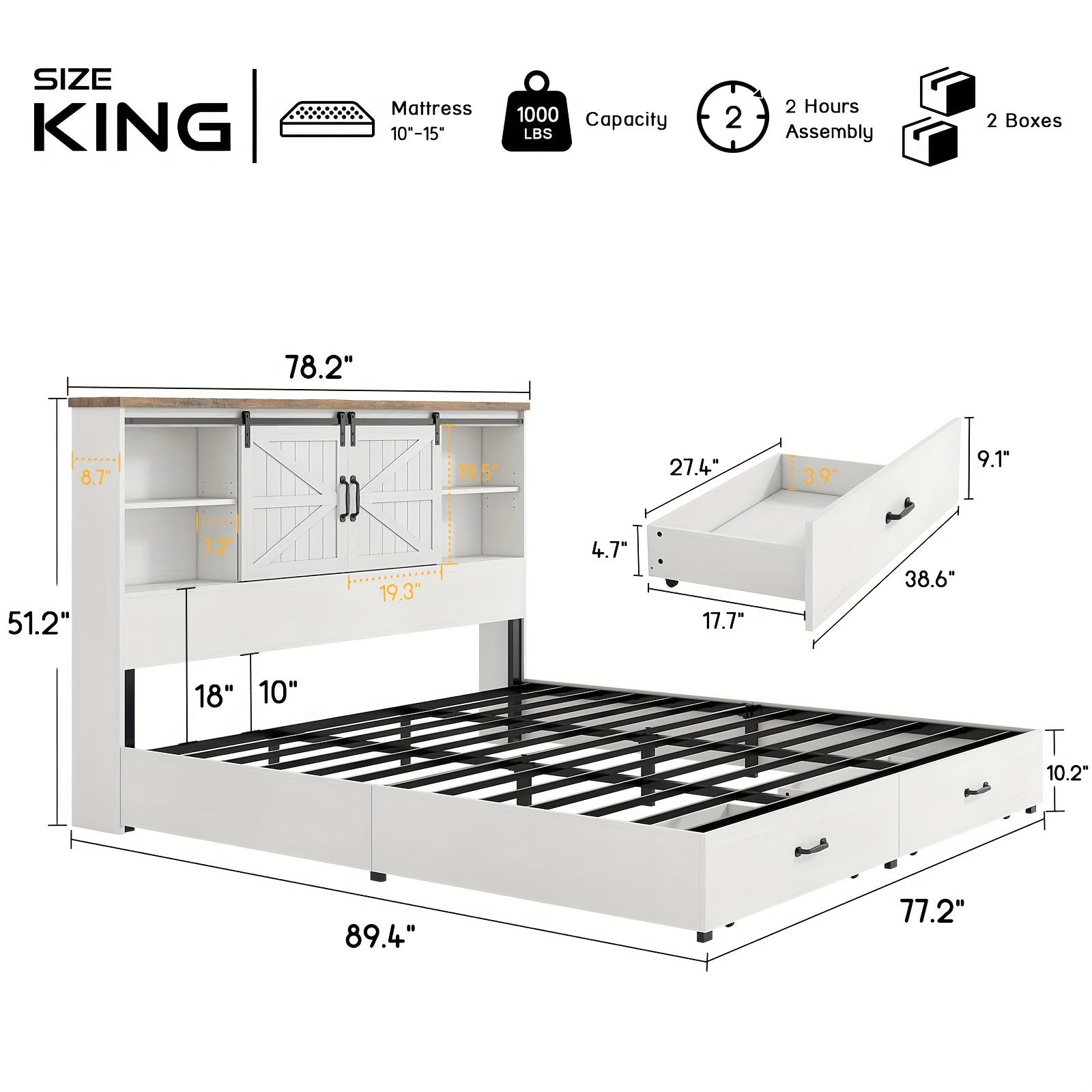 King Size Bed Frame, Wood Platform Bed Frame with 51.2" Storage Headboard, Barn Door Charging Station and Drawers, No Box Spring Needed, Noise-Free Farmhouse Design, White
