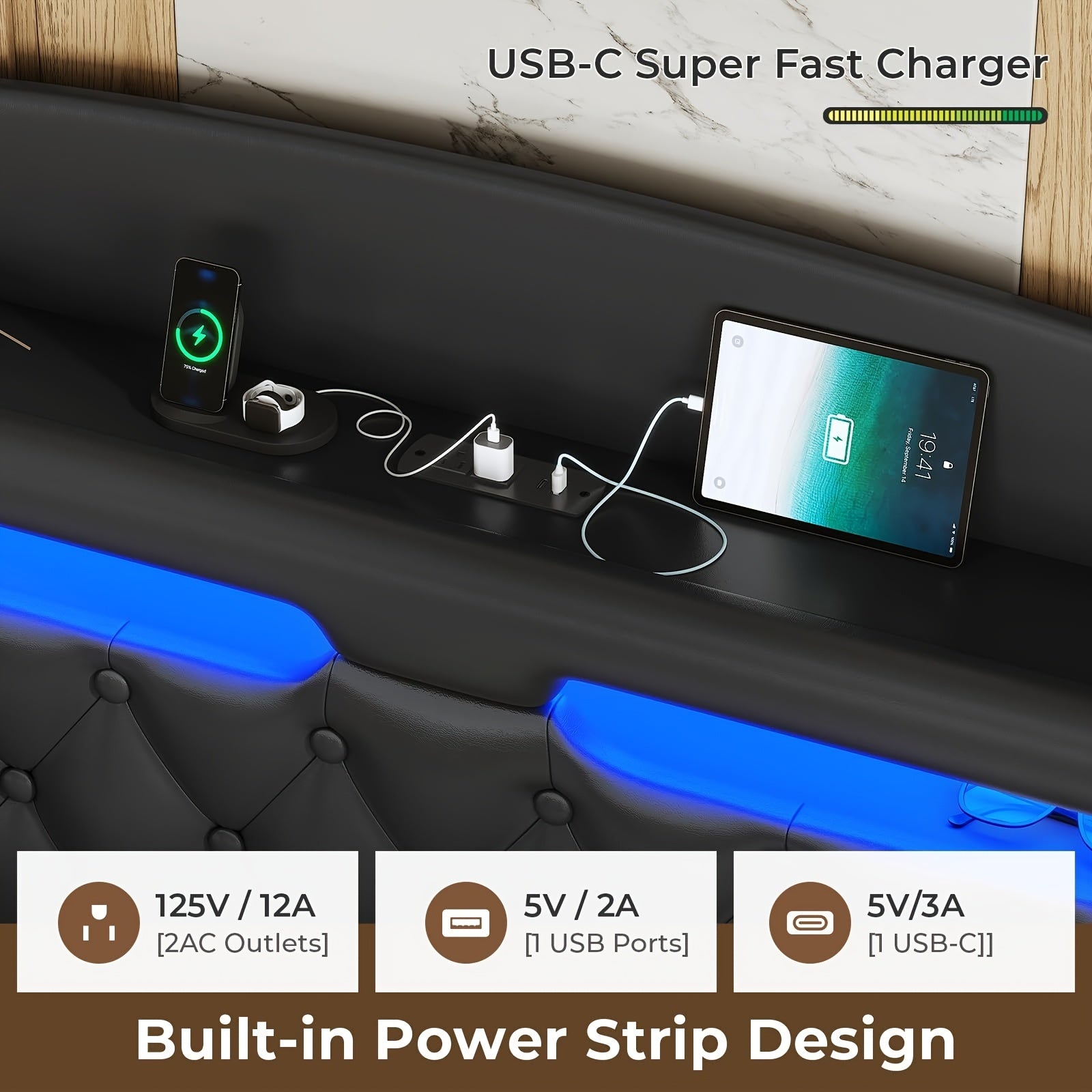 King Size Floating Bed Frame with LED Lights and Charging Station, Upholstered Leather Platform King Bed Frame with Hidden Storage Headboard, No Box Spring Needed, Black PU