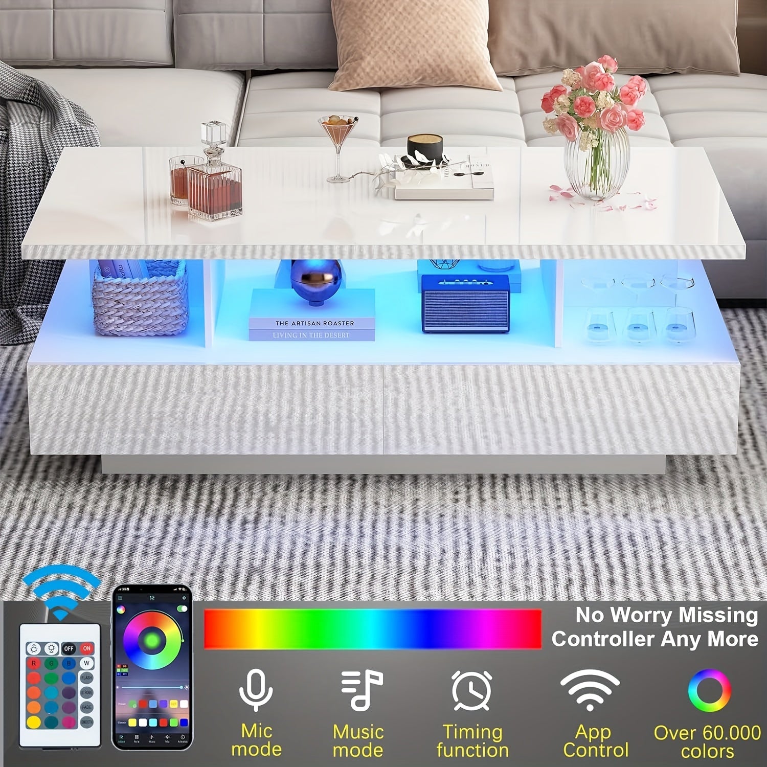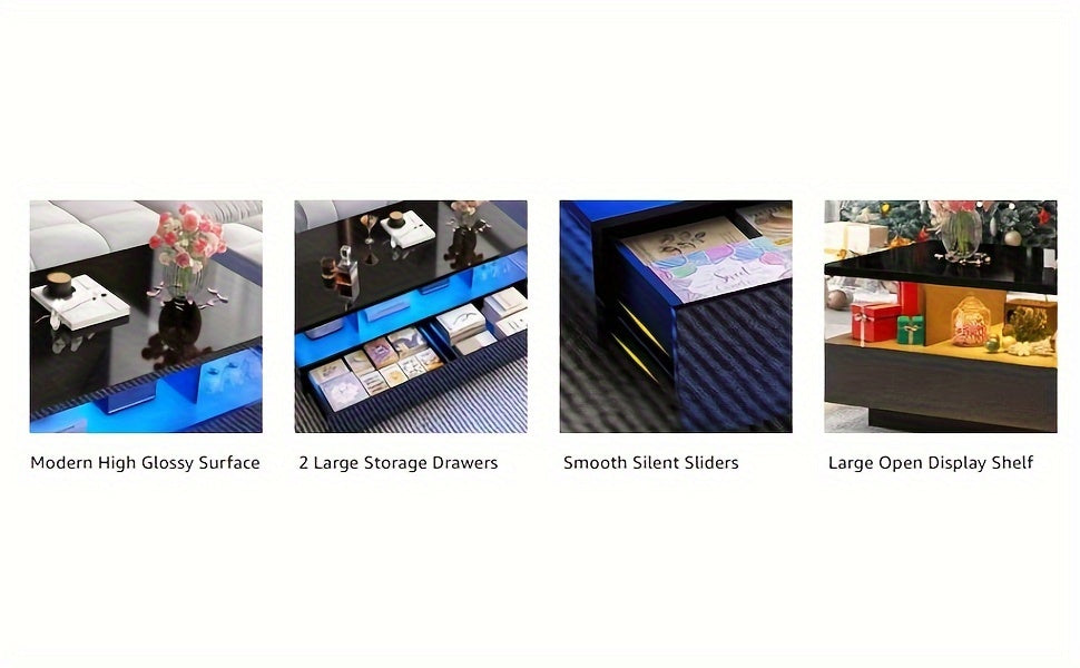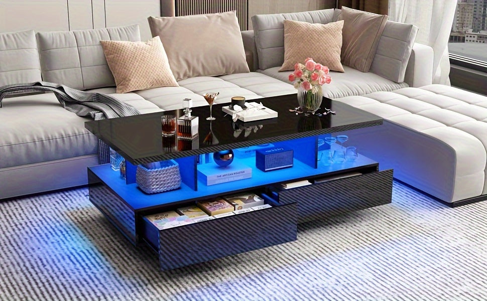 LED Coffee Table w/ 2 Storage Drawers, App Control, High Glossy Modern Black Coffee Table w/60, 000-Color Lights, Rectangle 2-Tier Center Table w/Display Shelf for Living Room