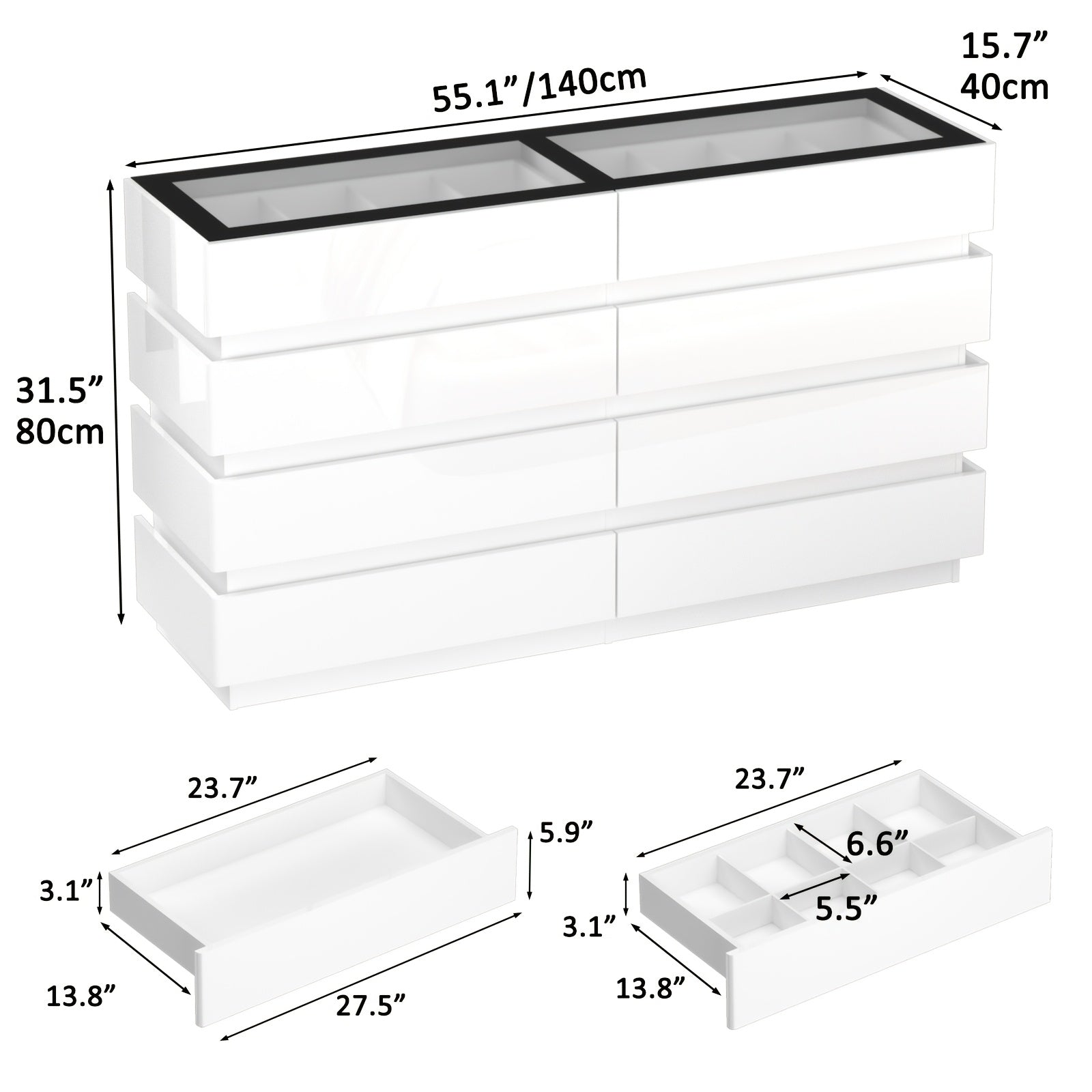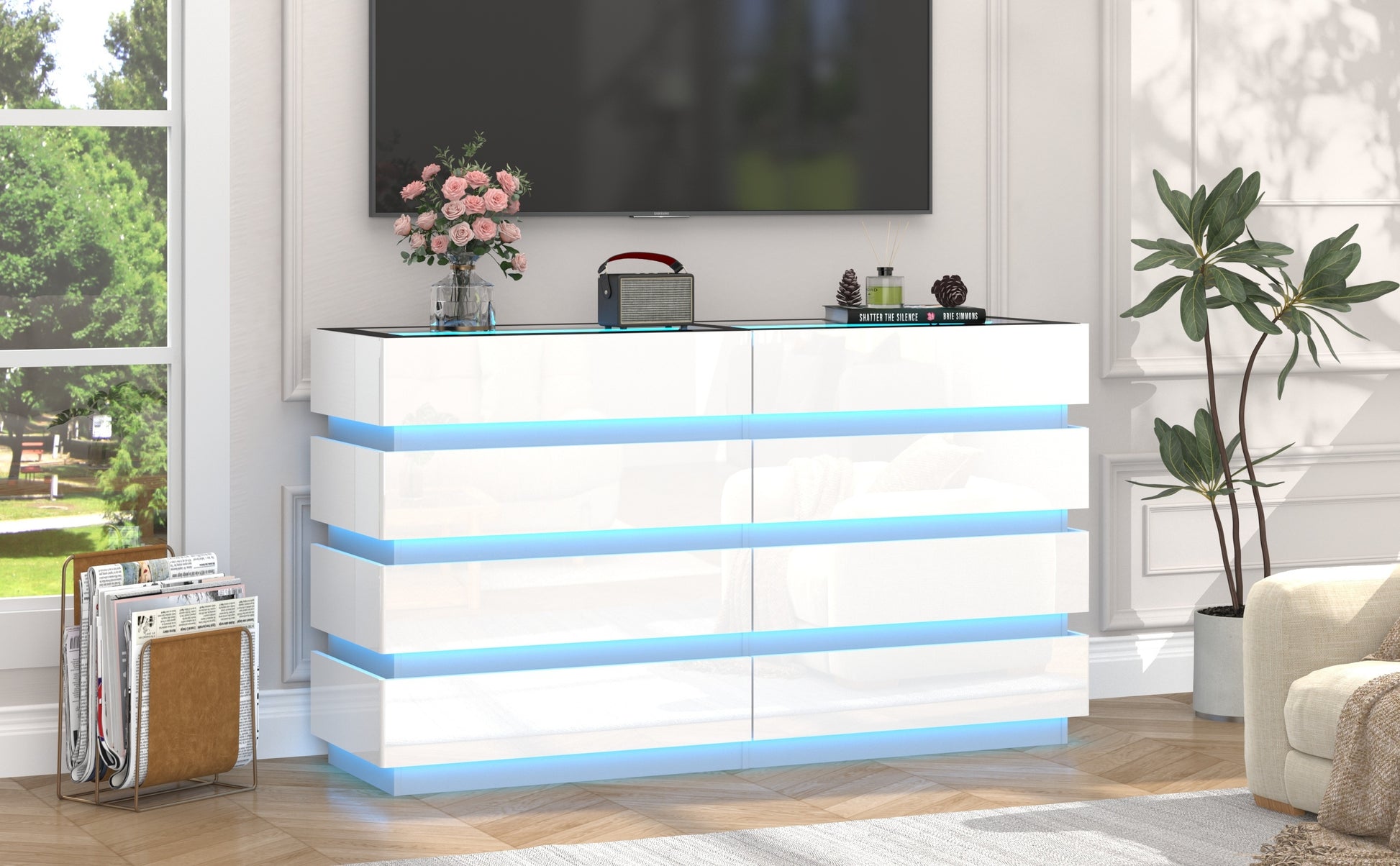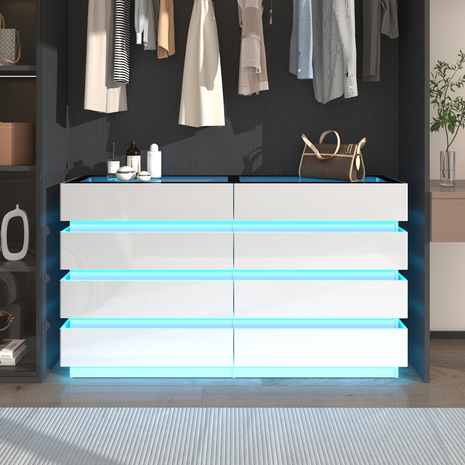 Modern 8-Drawer Dresser with Glass Top, High Gloss White Chest of Drawers, RGB LED Illumination, Wood-Based Panel & Hardwood Jewelry Display, with Closed Storage <3.2 Cubic Feet, for Bedroom, Living Room - US Plug, 110-130V