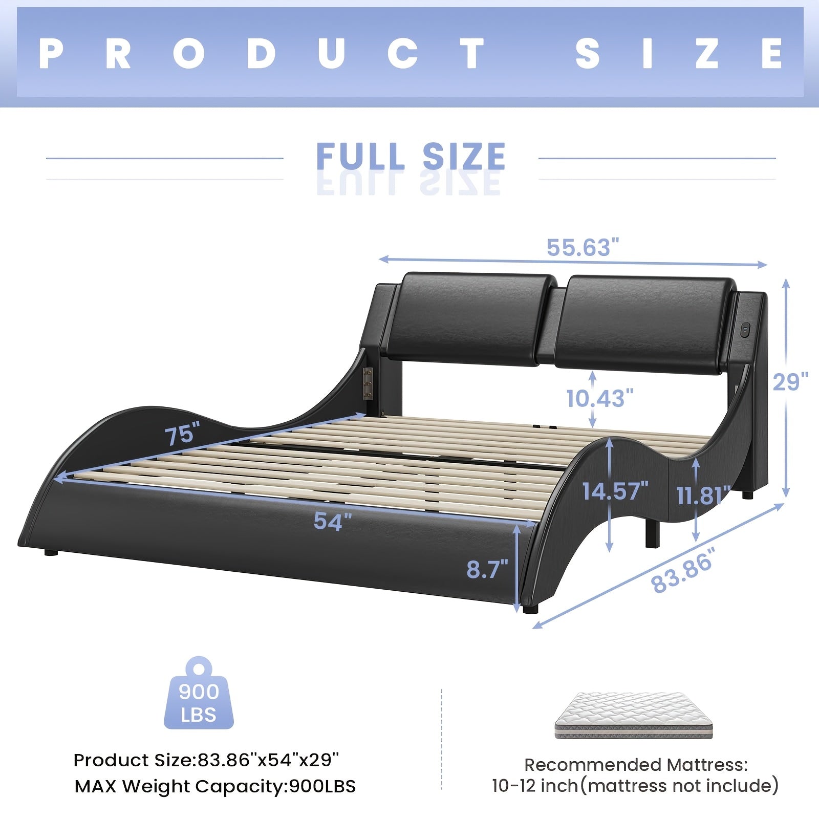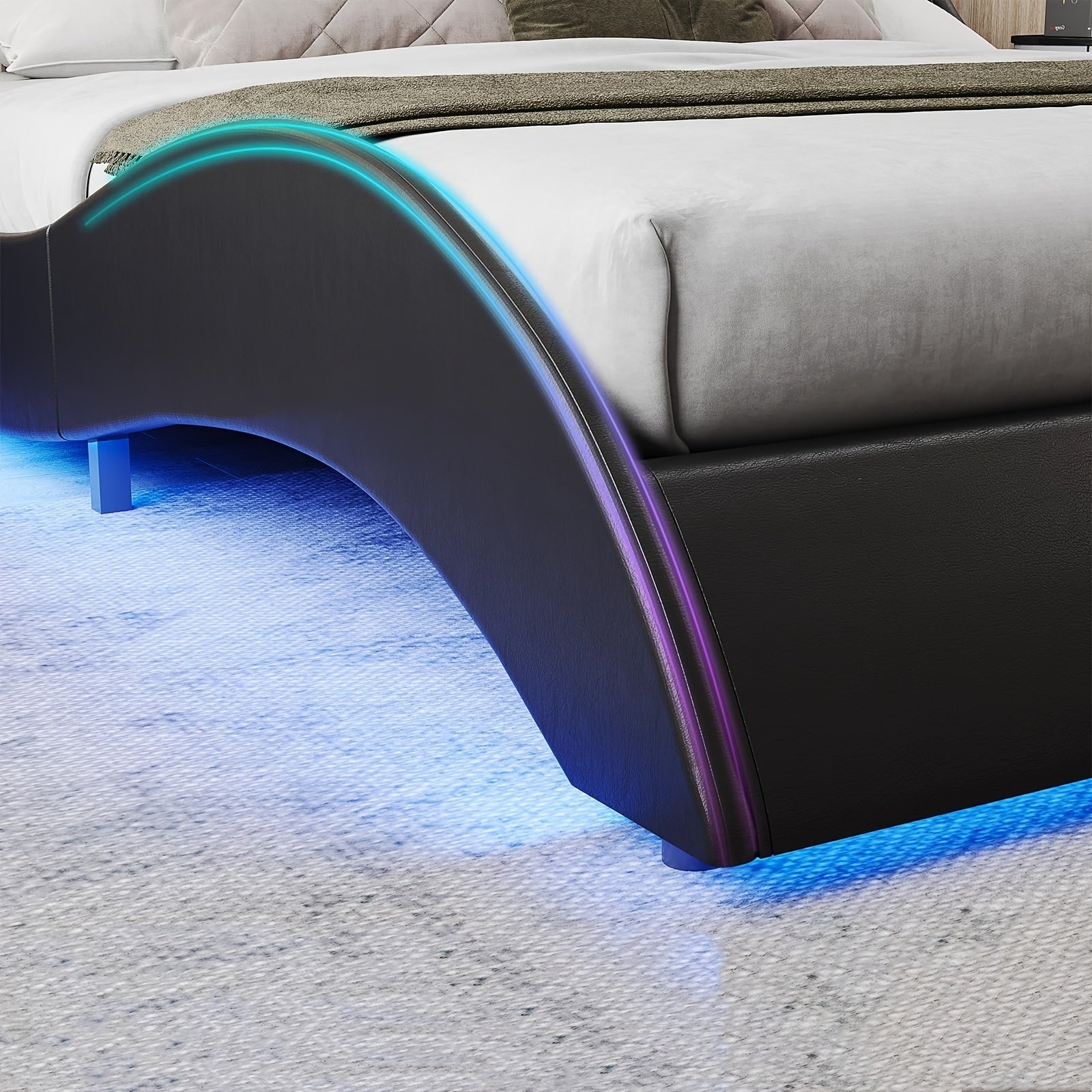 Modern Black Bed Frame with RGB LED Lights, USB & Type-C Ports - Easy Assembly, Faux Leather Wave Design Headboard