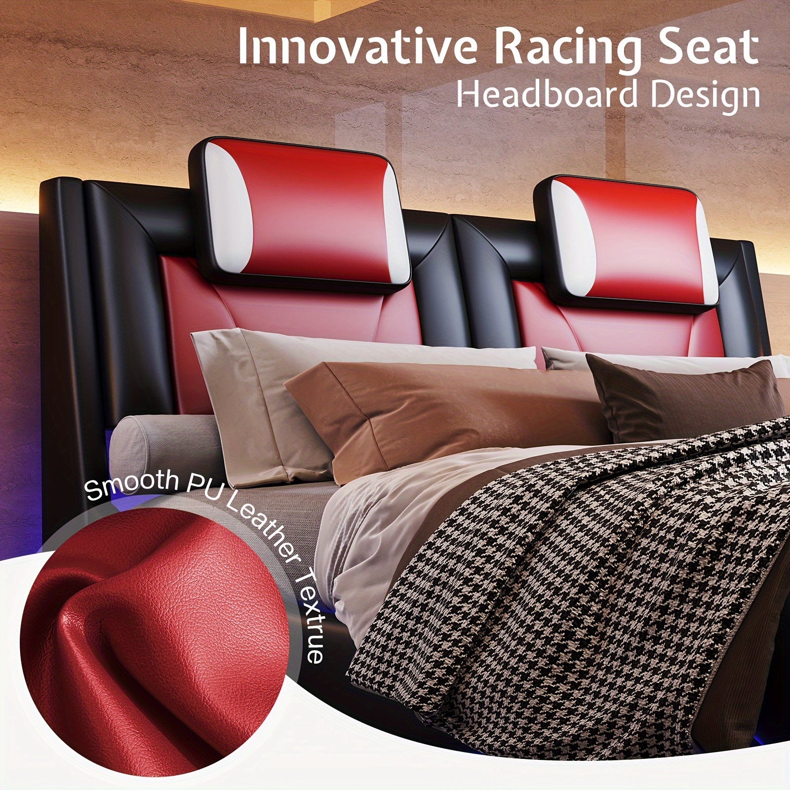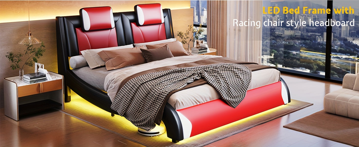 Modern Elegance Meets Functionality: PaPaJet Full Floating Bed Frame With Built-in LED Lights, Faux Leather Upholstery, & Wave-Shaped Curves, No Box Spring Required