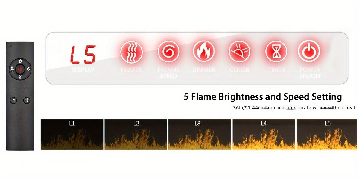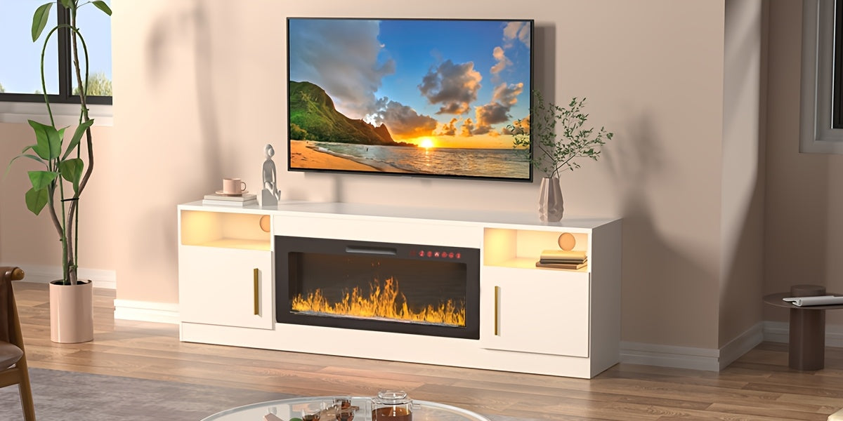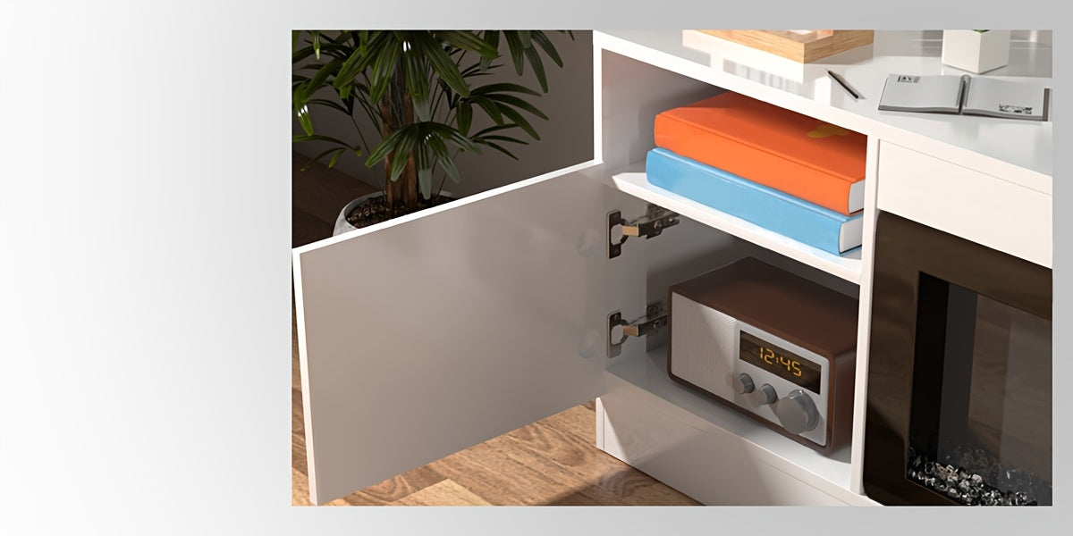 Modern LED Fireplace TV Stand, 36" Electric Fireplace Entertainment Center with Storage Shelves, Metal and Wood Construction, Assembly Required, Fits Up to 80" TVs - White
