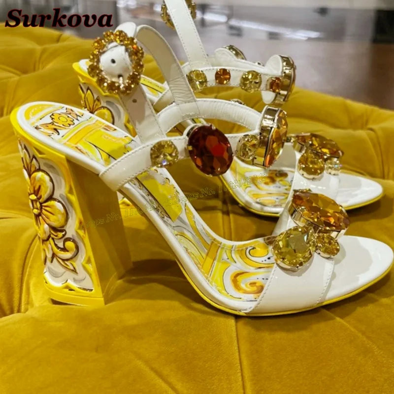 New Summer Gemstone Thick Heel Printed Beach Sandals Women'S Retro Rhinestone Crystal Open Toe Fashion Banquet Dress Sandals 43